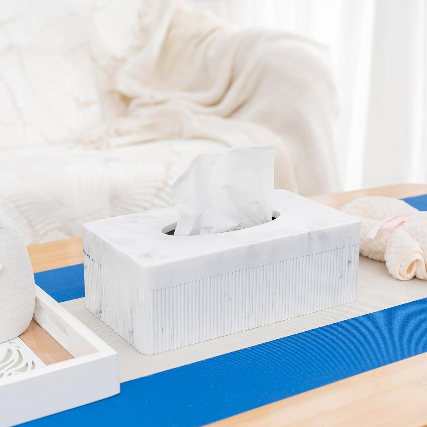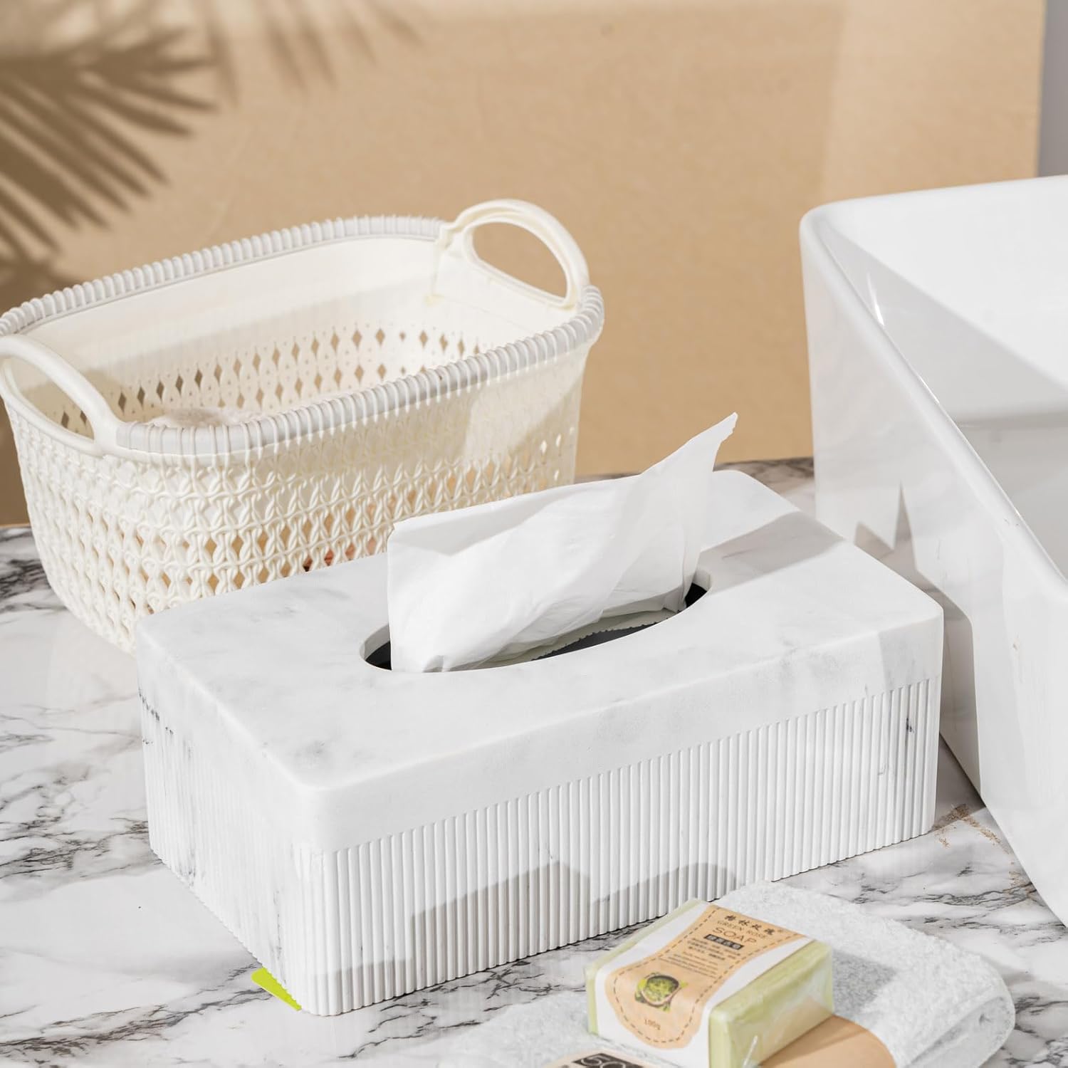 Marble Tissue Box Cover, Rectangular Napkin Facial Tissues Holder for Home Office, Hand Poured Marble Tissue Box Holder, 10 x 5.7 x 3.7 inches, White