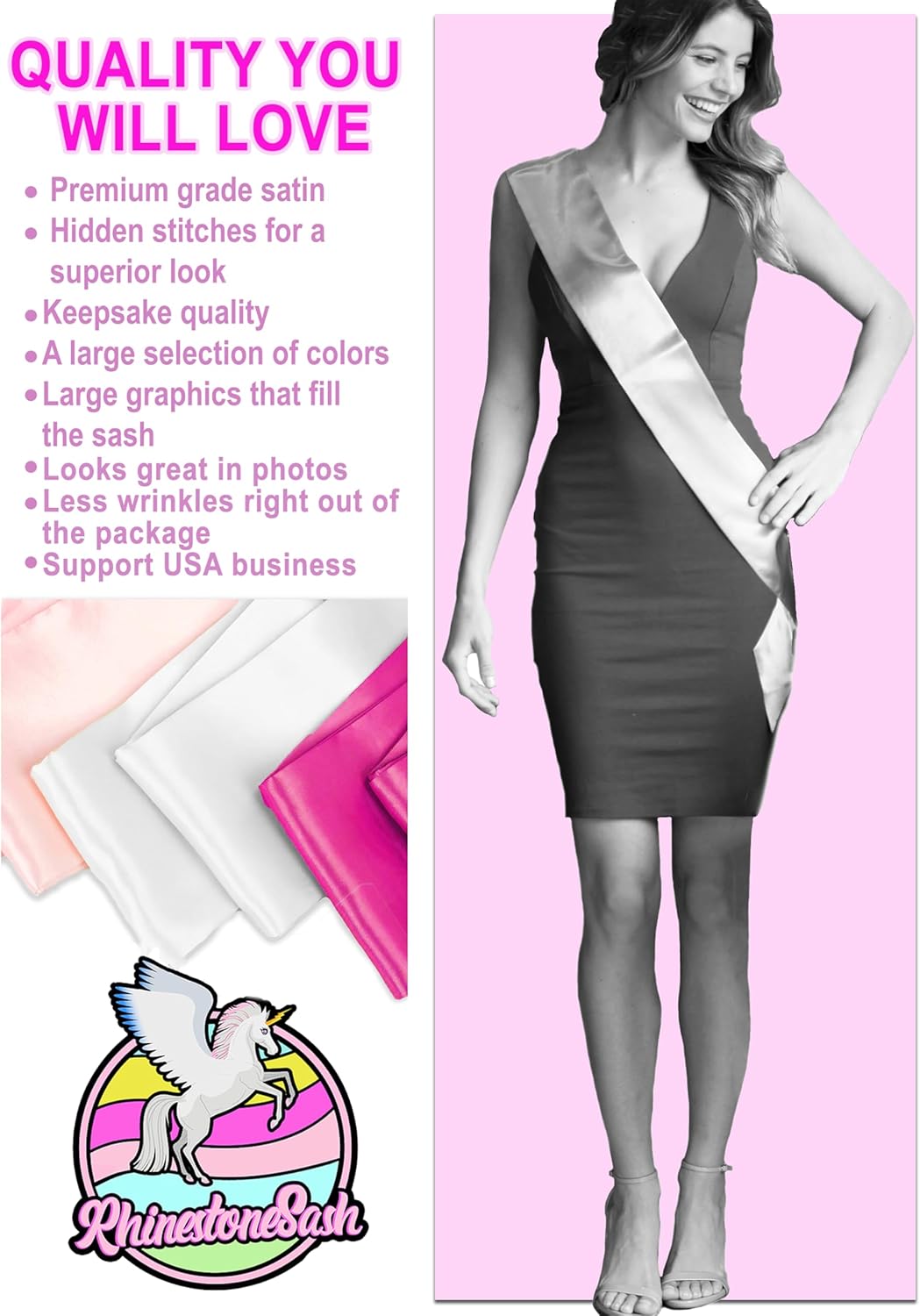 • UNMATCHED BRIDAL SASH QUALITY! RhinestoneSash prides itself on offering the best sashes on the market. Our premium double layer satin sashes are the perfect keepsake gift. The Bride will be able to wear these fun sashes to all of their pre-wedding parties. This is NOT a piece of cheap ribbon.