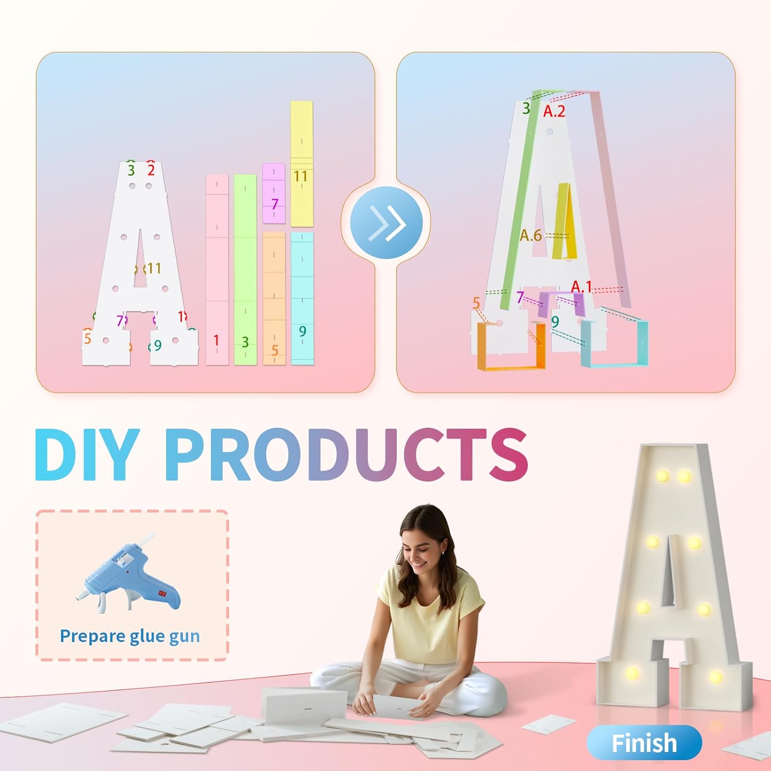 • Assembly Needed: Each marquee letters are pre-cut frame with slots, 1) Match the slots on the board and put all boards together by hot glue. 2) Screw the bulbs on the board and install 3 AA batteries. (Noted: Glue gun and batteries are not included)