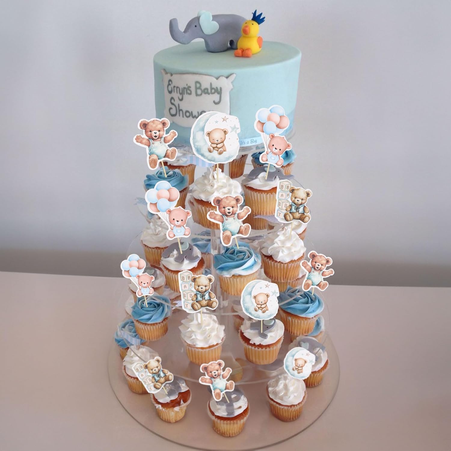Gyufise 32Pcs Baby Shower Bear Cupcake Toppers Moon Baby Bear Baby Shower Cake Topper Decorations Jungle Animal Theme Birthday Party Cake Supplies Blue