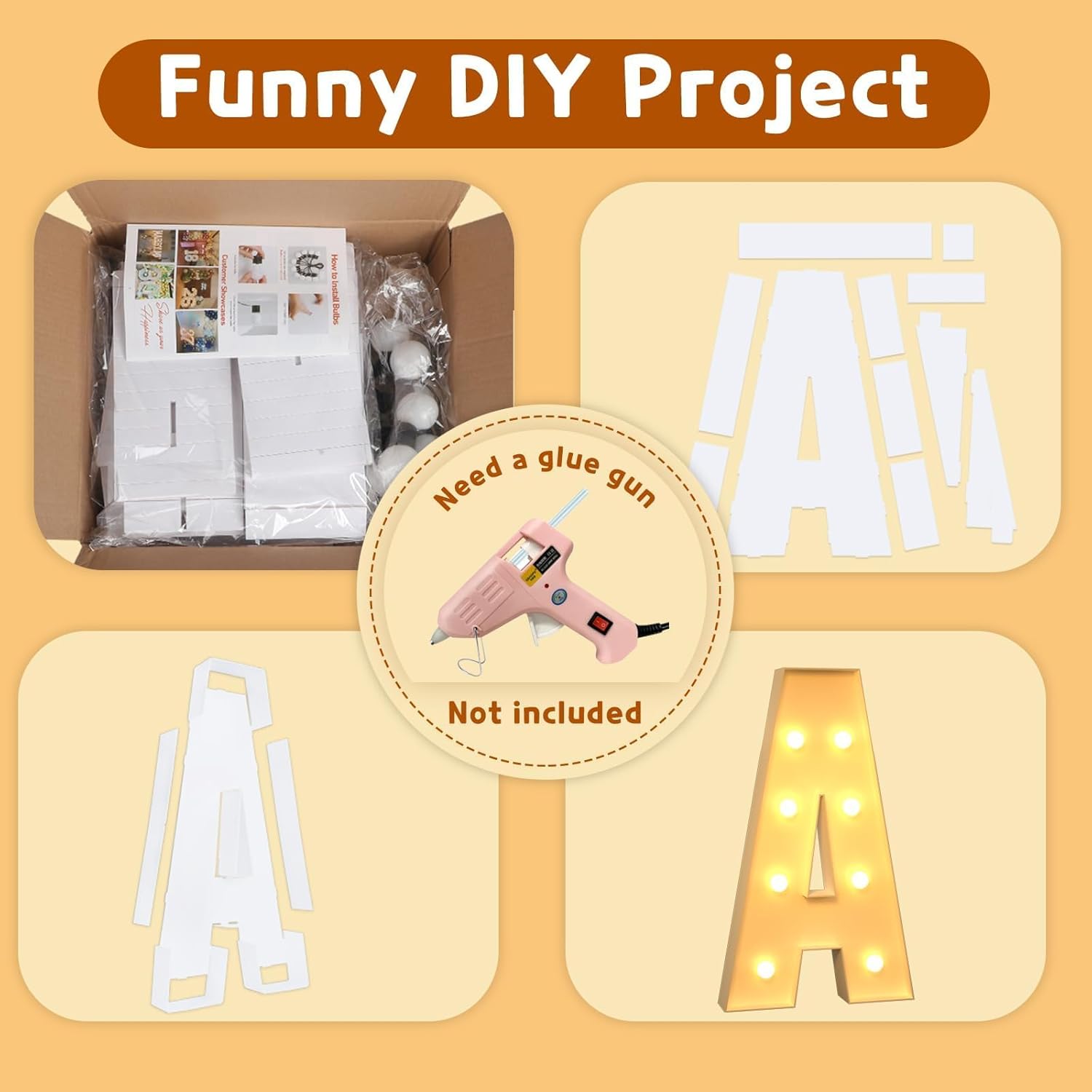 • Need to Assemble: 3 ft marquee letters are pre-cut frame with slots, 1) Match the slots on the board and put all boards together by hot glue; 2) Screw the bulbs on the board and install 3 AA batteries