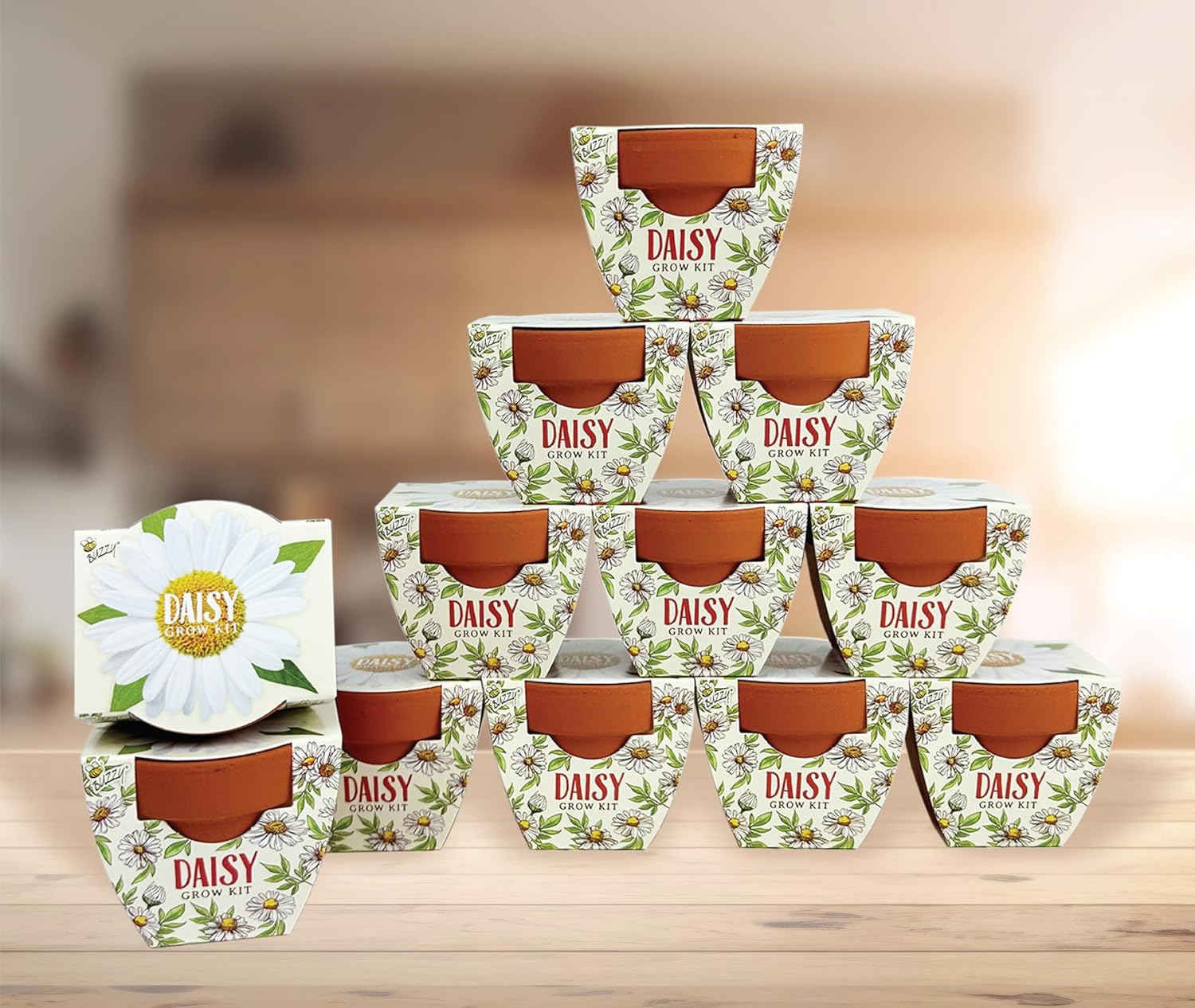 BUZZY Seeds Daydream Mini Terracotta Pots 12-Pack with Daisy Seed Packets – All-in-One Starter Set with Growing Medium and Easy Instructions, Gardening Gift, Wedding Favors, Corporate Gifting