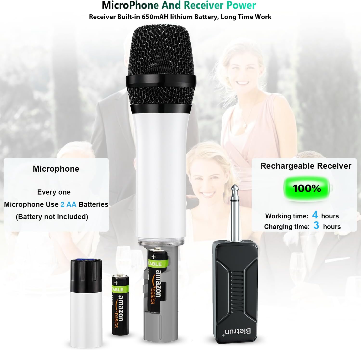 • Microphone Battery Powered and Rechargeable Receiver: The Microphone Does Not Come With Any Batteries, We Recommend Using 2 AA Amazon Alkaline Batteries. ●Correctly install the battery + - direction.●the receiver should be charged for 5 hours before the first use●Long Press and hold the Mic and Receiver buttons to power on. The Chargeable Receiver Is Built-In 700 mAH Battery For 4.5 Hours work Time And Fully Charged In 3 Hours.