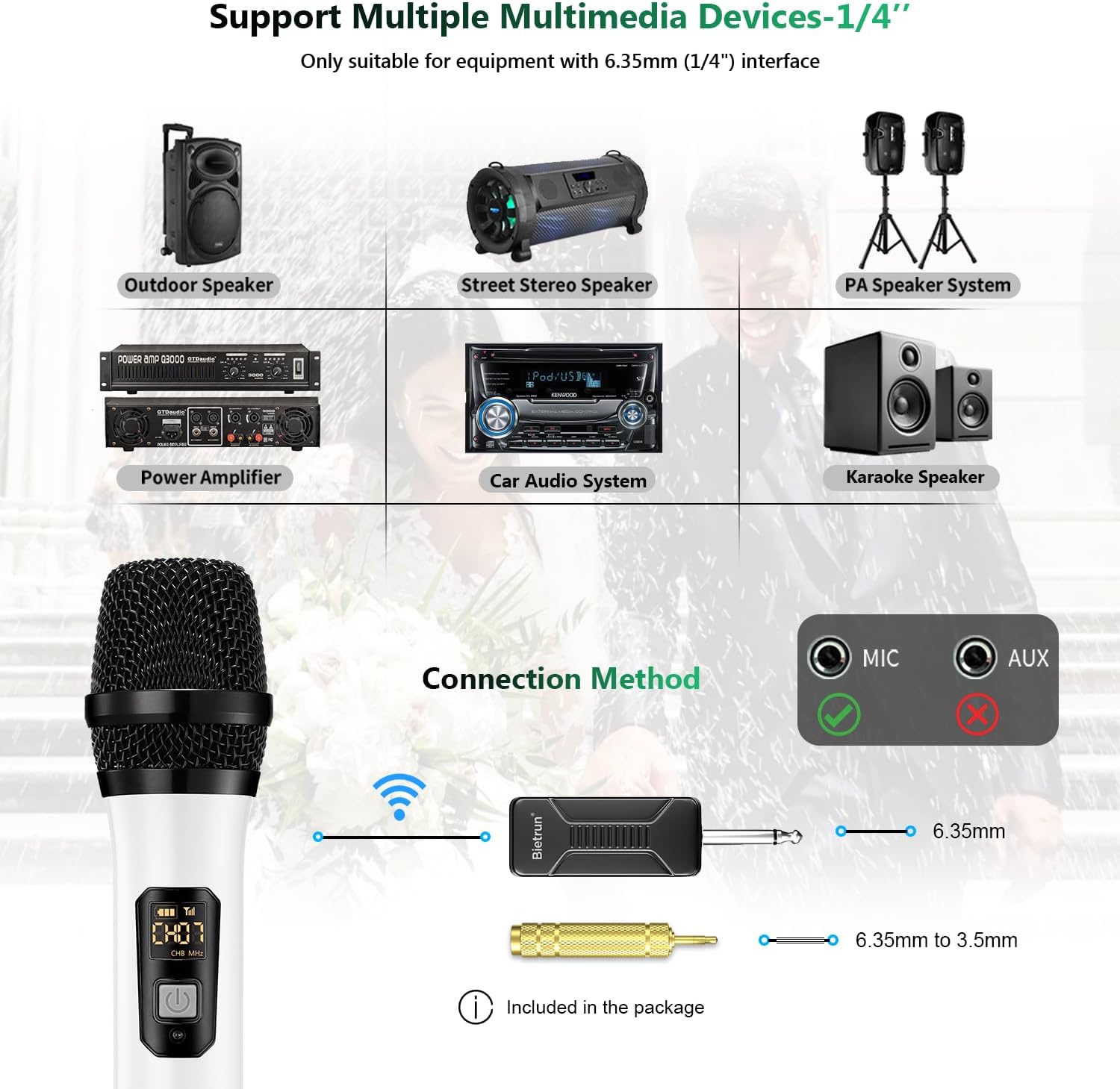 • Plug And Play, Easy To Use: ●Can Only Plug In equipment with Mic input, Can't Plug In AUX input, Otherwise No Sound. (Not compatible with Bluetooth Speakers and Laptop)●For Speaker, Singing Machine, Audio Amplifier, Pa System, Mixer, Voice Amplifier And More Streaming Multimedia Equipment.●The Display Can Show The Battery Power And Signal Strength In Real Time, Don'T Worry About Suddenly Not Working.