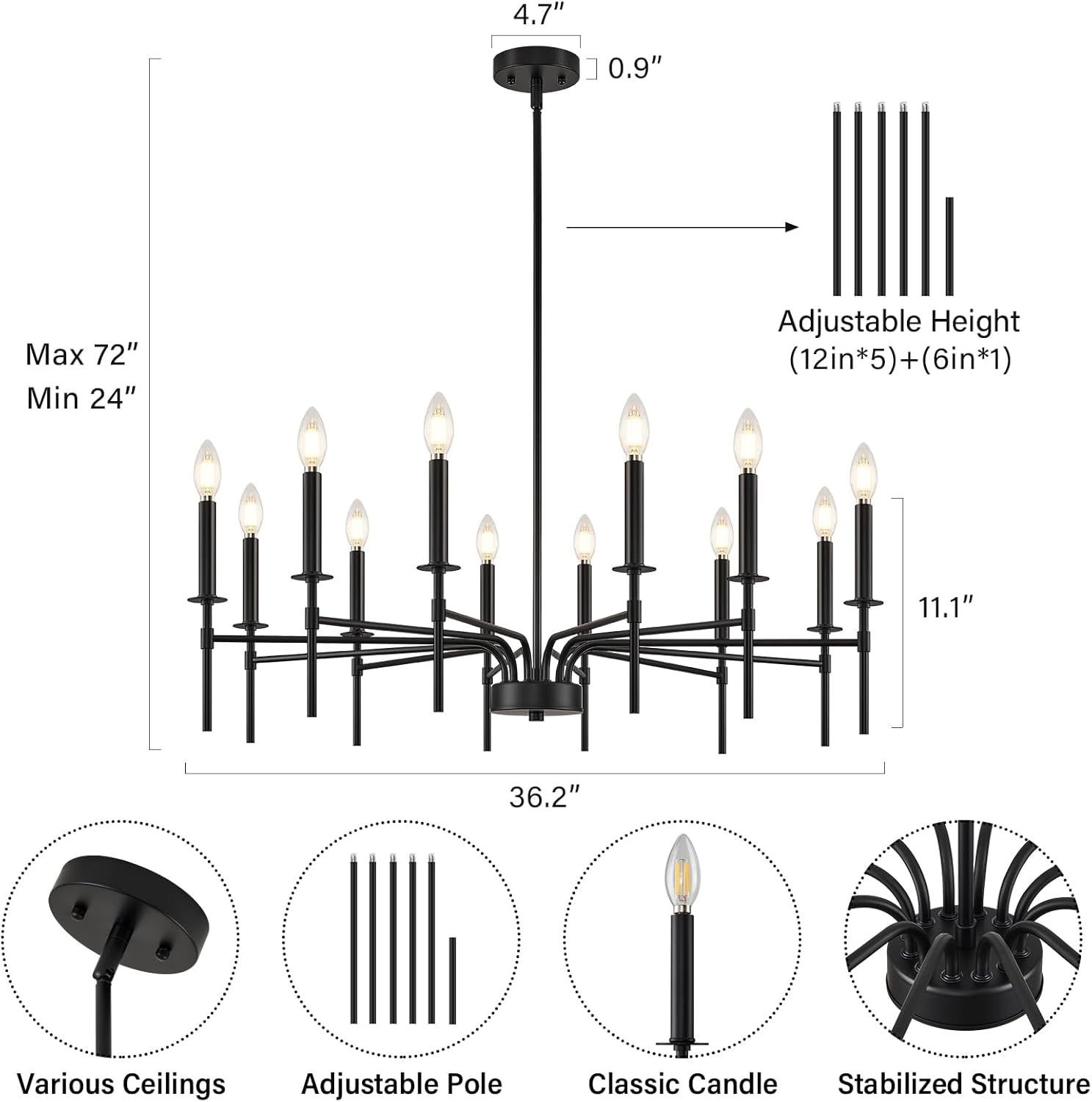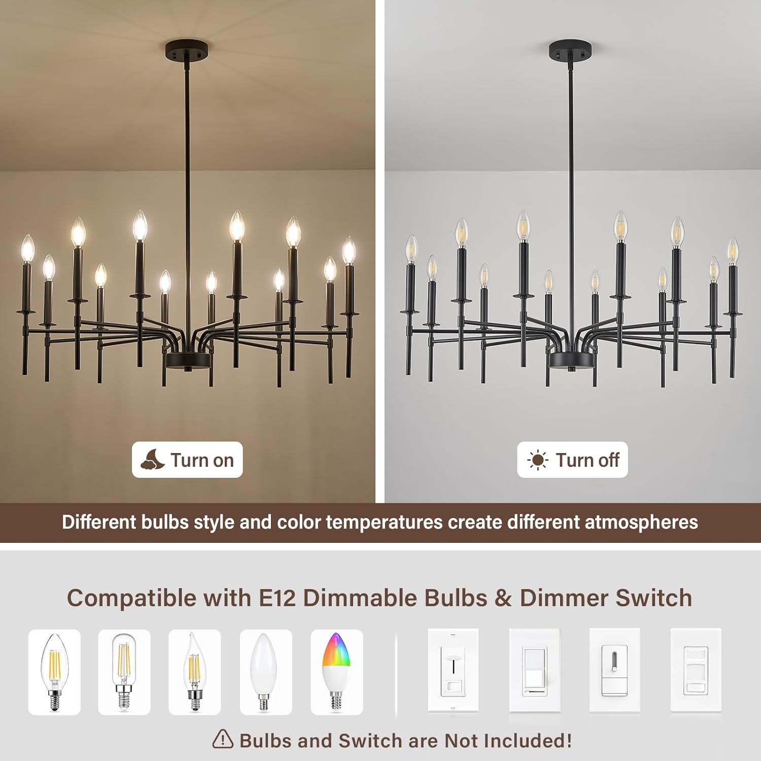 • Dimmable and E12 Bulb Compatibility: With 12 E12 candelabra sockets, this black chandelier is compatible with various E12 bulbs (incandescent, LED, CFL, and halogen, 40W MAX / bulb), offering dimmable functionality to create the perfect ambiance. This black matte chandelier allows for flexible lighting control, making it suitable as a black chandeliers for dining room, or master bedroom chandelier (NOTE: bulbs and dimmer are NOT included)