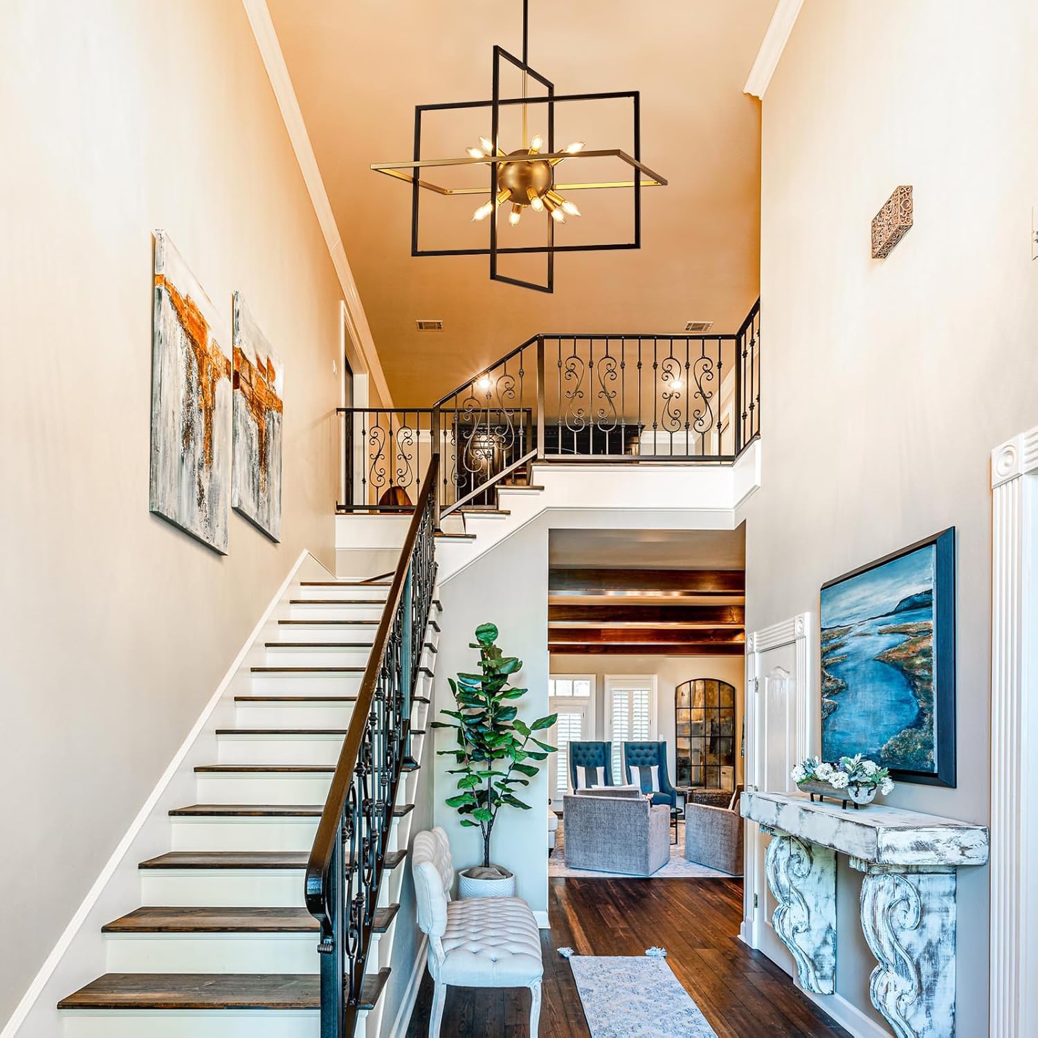 • 【Large-Scale Frame Design】The stunning combination of modern and industrial elements brings an unprecedented sense of style to your space with this awe-inspiring cubic geometric pendant light. The center of the artificial satellite chandelier features 12 golden lights surrounded by two layers of rectangular metal frames. It's perfect for living rooms, kitchen islands, dining rooms, hallways, staircases, entrances, coffee shops, and restaurants.