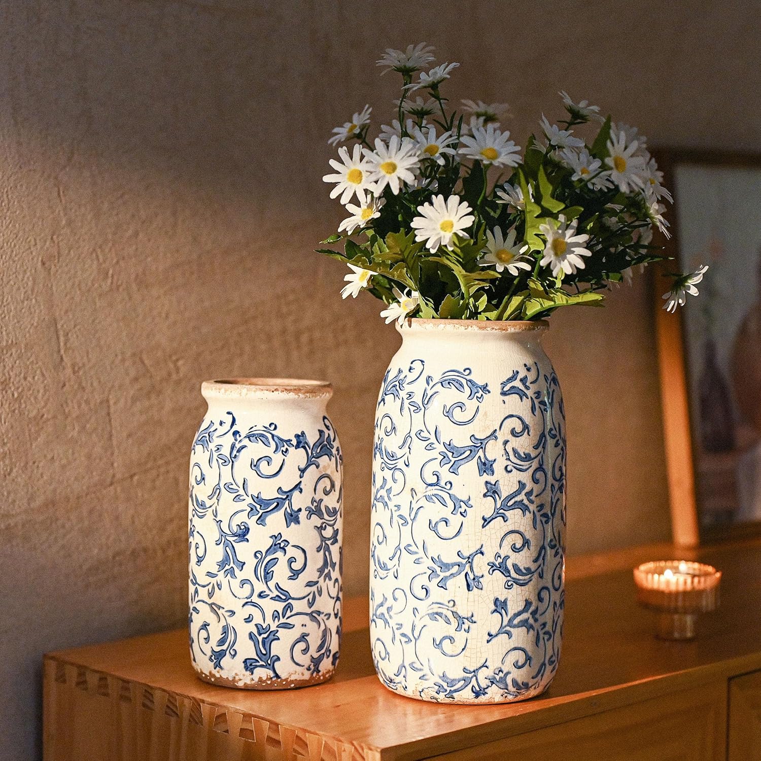 VICTOR & TERESA Rustic Large Blue and White Vase for Home Decor, 10'' Tall Ceramic Vases for Flowers, Farmhouse Decorative Vases for Pampas Grass,Table, Mantel, Living Room, Centerpieces