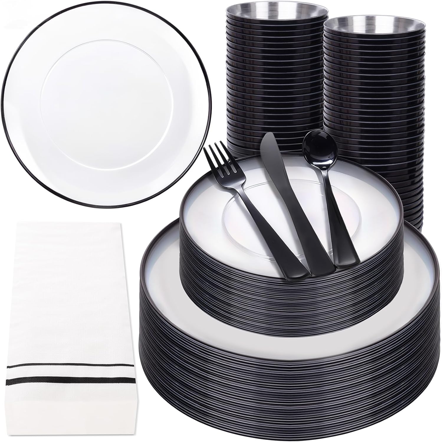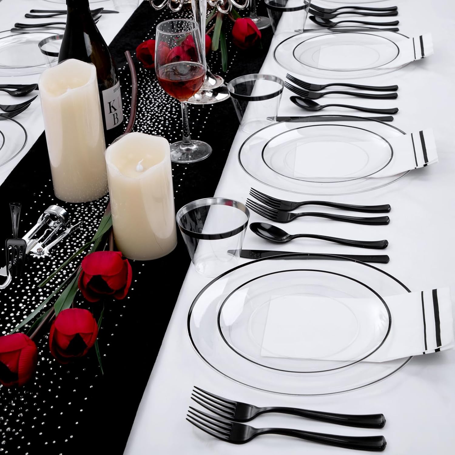 • FOR ANY OCCASION: Our clear plastic plates have a delicate design with a black edge, which makes it suitable for any occasion. You can use these black disposable dinnerware set for any party and occasion such as birthday,weddings,engagements,anniversaries,graduations and more.
