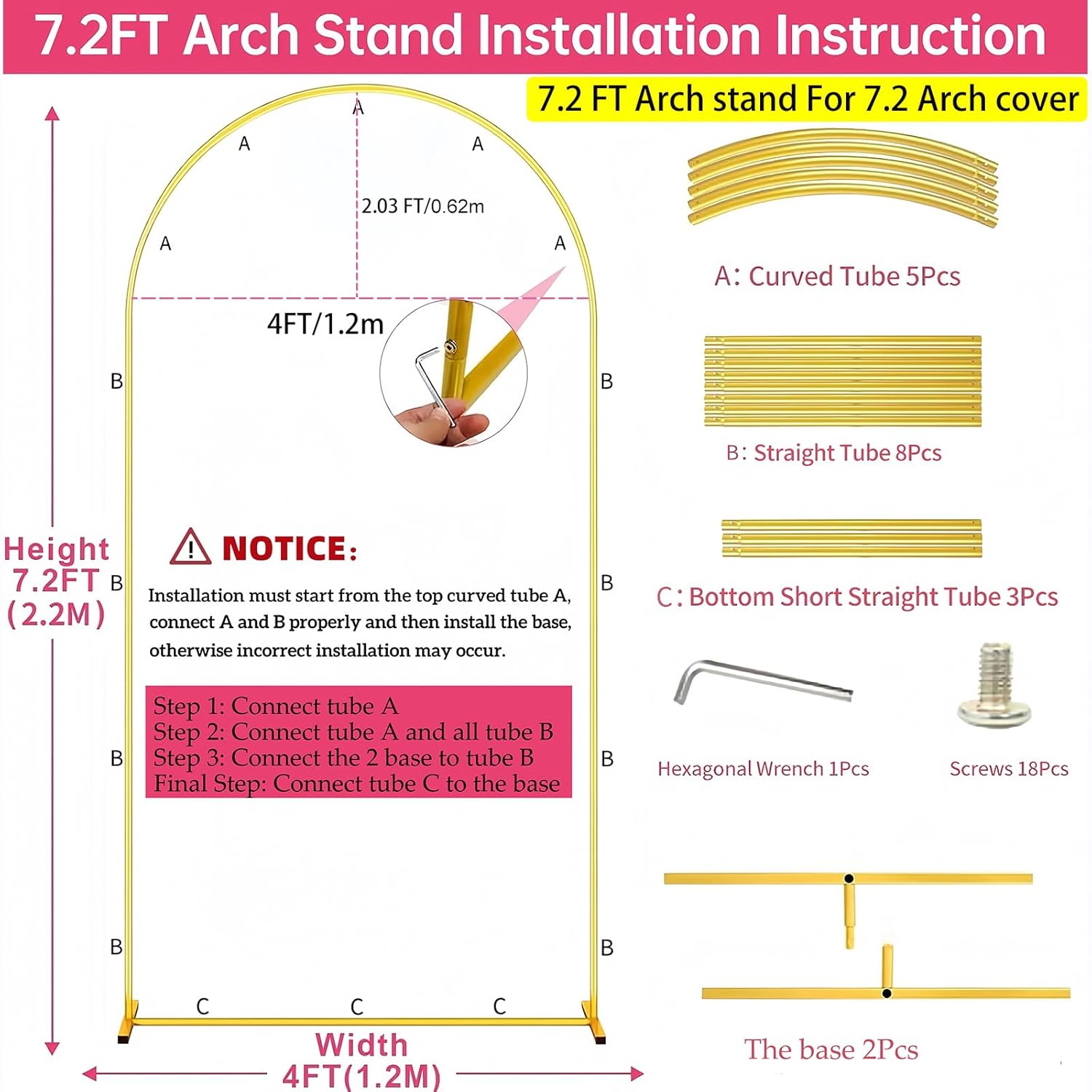 • Note:7.2FT Arch Stand for 7.2FT Arch cover. Installation must start from the top curved tube,connect curved tube and Straight tube properly and then install the base,otherwise incorrect installation may occur