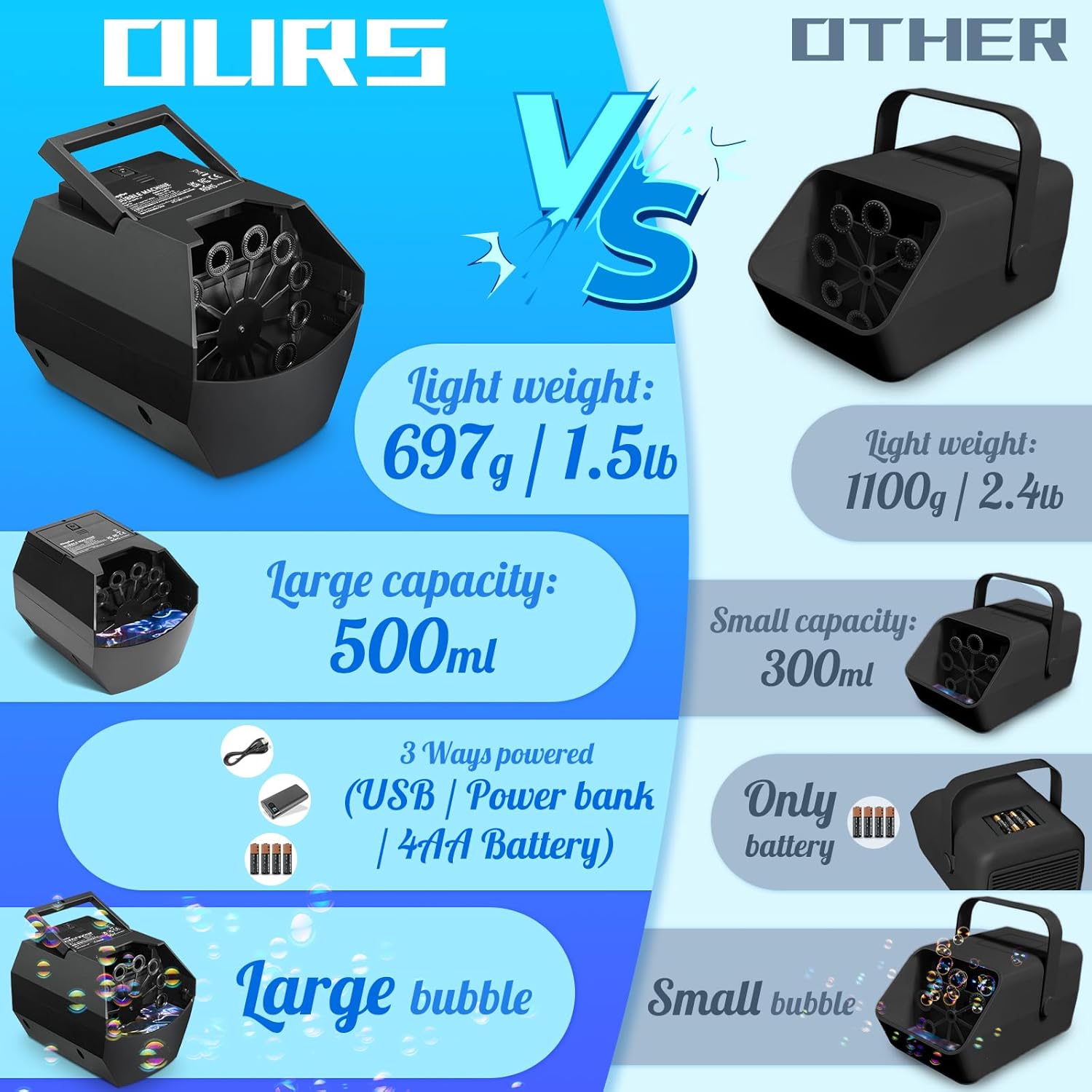 • 500ML High Capacity For Continuous Use: The larger 500ml/17oz capacity of the solution tank can hold up to 45+ mins for continuous use. It is not necessary to add bubble liquid during a party, wedding, or birthday so that you can enjoy uninterrupted happy bubble time