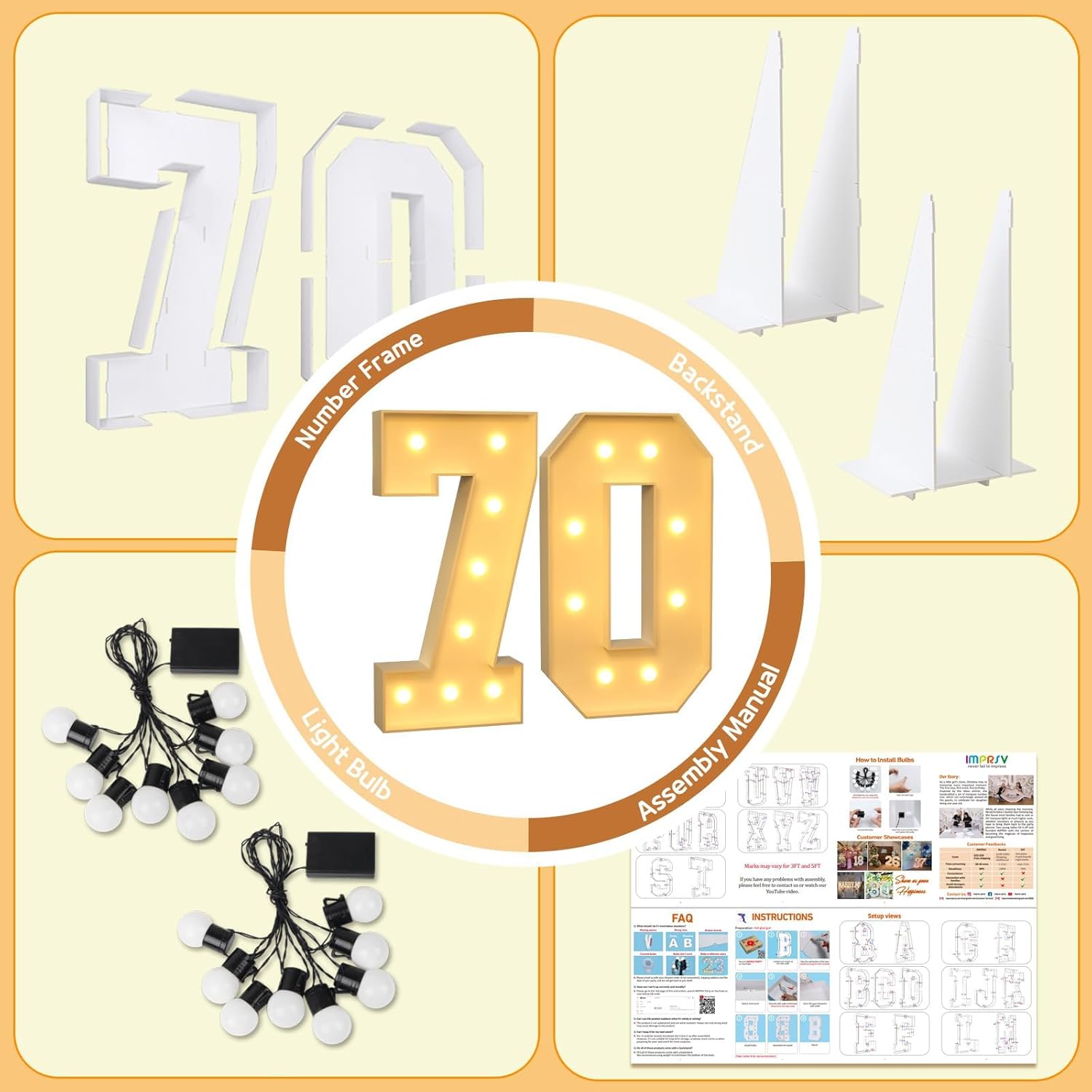 • Package Includes: A set of light up numbers for party containing 2 pre-cut numbers frames, 2 light bulb strings and assembly instruction. (Noted: Glue gun and batteries are not included