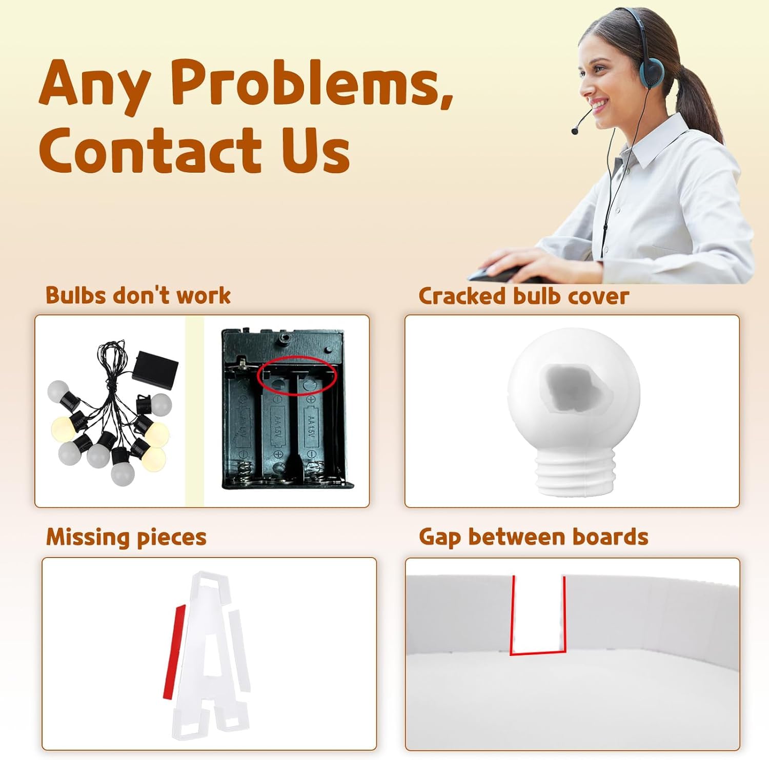 • Assembly Needed: Marquee numbers are pre-cut frame with slots, 1) Match the slots on the board and put all boards together by hot glue; 2) Screw the bulbs on the board and install 2 AA batteries