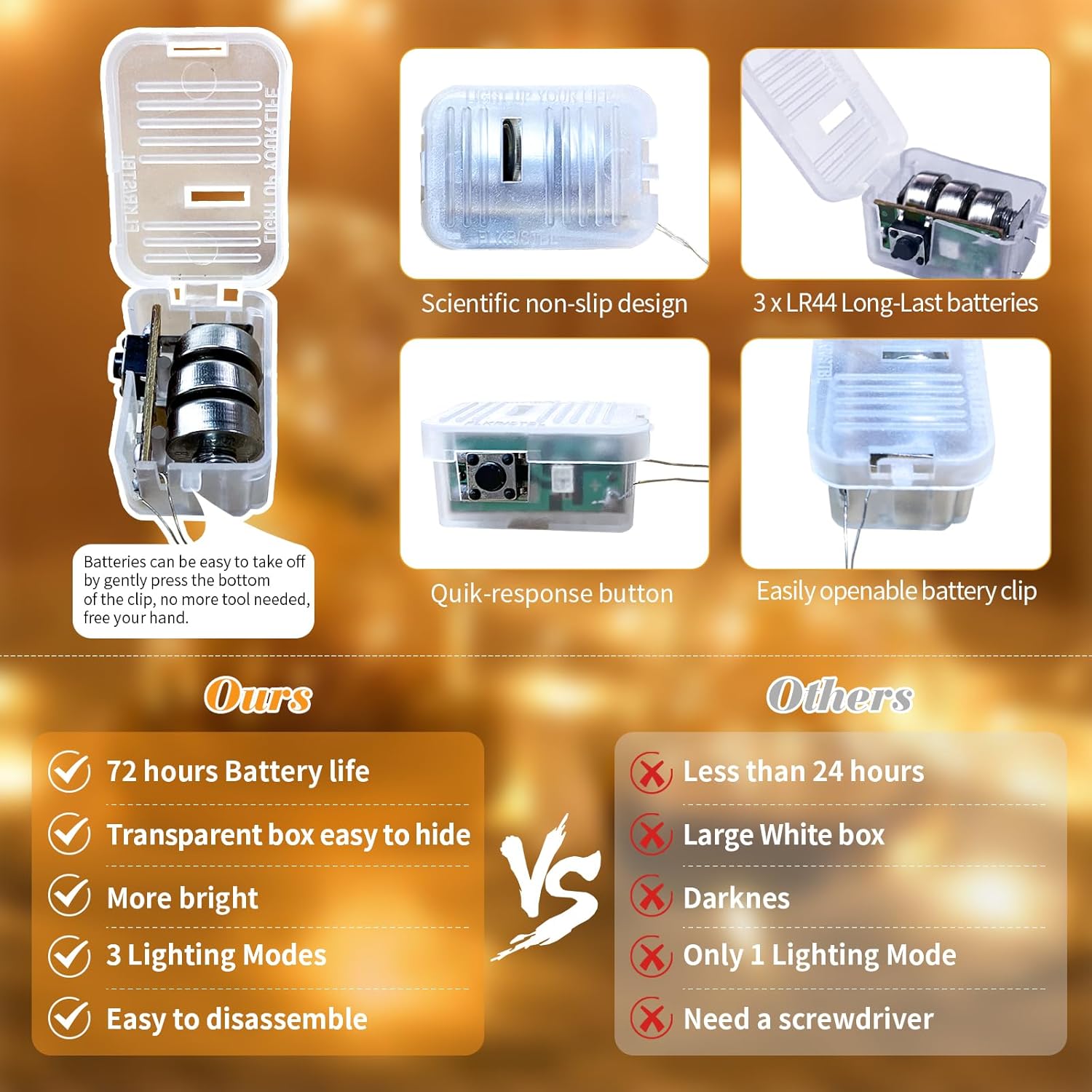 • IP65 WATERPROOF AND INDIVIDUALLY WRAP: The battery fairy lights are waterproof can be used for Indoor/Outdoor. (the battery pack is not waterproof) safe to the touch. Made of soft bendable wire so you can easily bend into any shape or wrapped it on anything such as Christmas trees, wine bottle, pumpkins, guirlande lumineuse interieure, potted landscape etc.Each light is individually packaged, say goodbye to cable tangles and bring more happiness and satisfaction to your family and friends