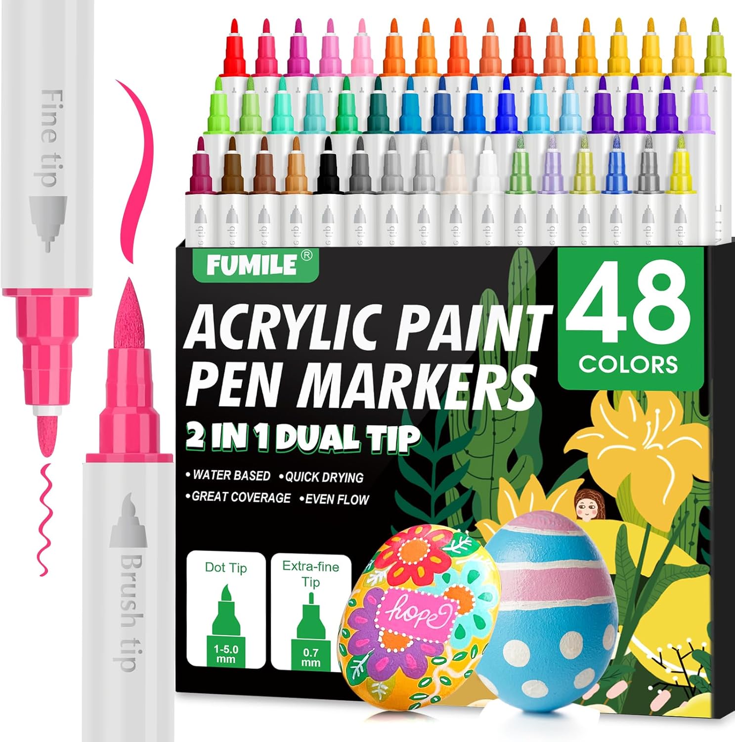 FUMILE 48 Colors Dual Tip Acrylic Paint Pens,Paint Markers With Extra Fine Tip and Brush Tip for Wood, Rock, Glass, Ceramic, Canvas, Paper.Paint Markers for DIY Craft,Halloween and Christmas