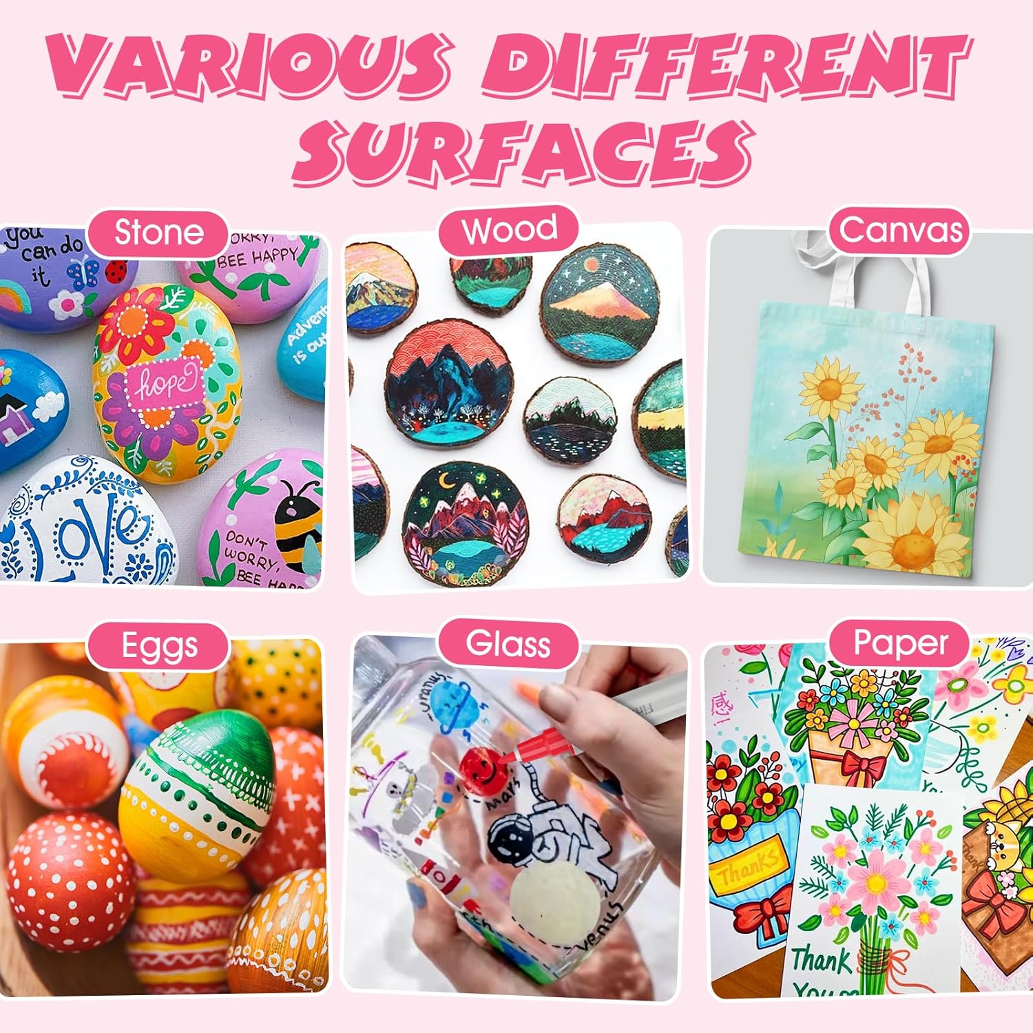 • 【Widely Used】Acrylic paint pens have the characteristics of strong coverage,quick drying,and smoothness, making them suitable for various surfaces.such as canvas,wood,metal, rock painting,glasses,plastic,paper,ceramics,and more.
