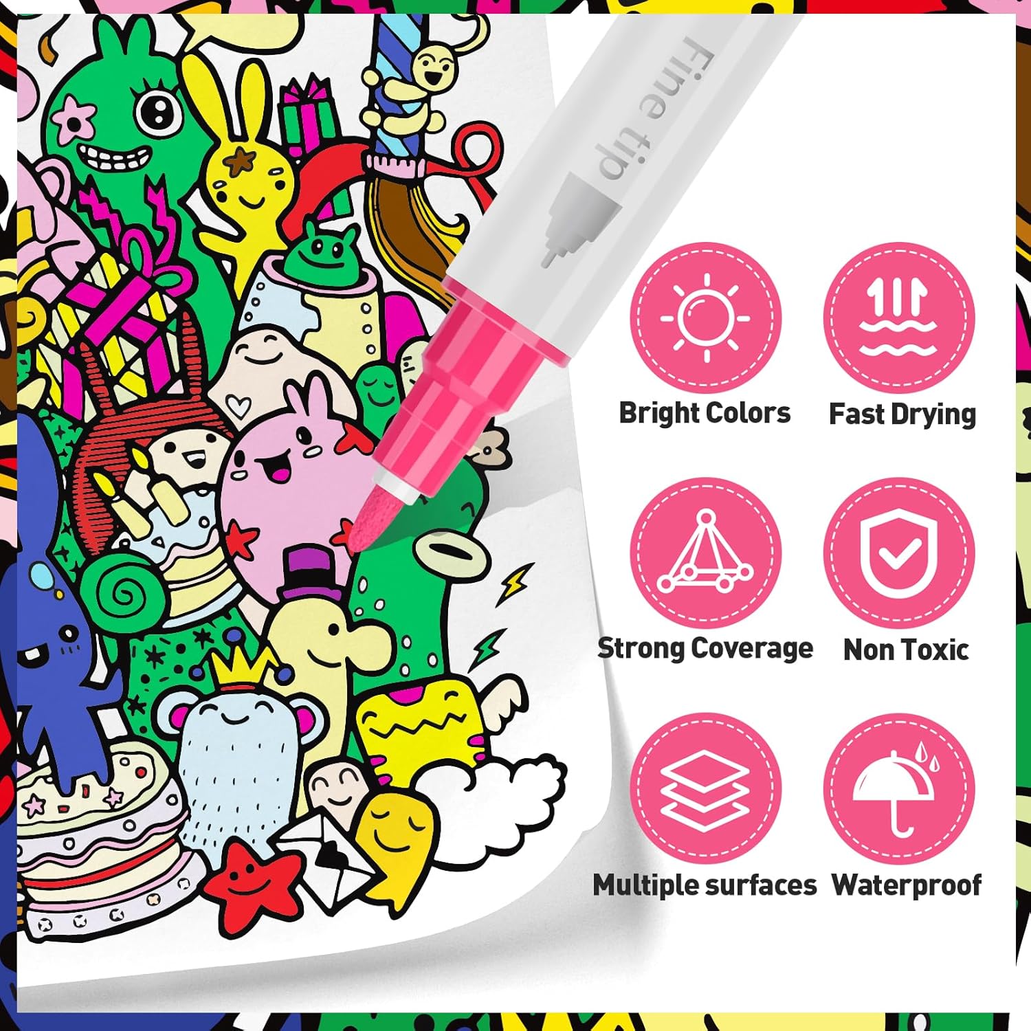 • 【Practical Dual Tip】Each acrylic paint marker come with a 1mm extra fine tip and 1-5mm brush tip,Dual tip acrylic paint pens meet different design requirements.Fine nibs are more suitable for handling details.Such as outlining, fine line work.The brush tip can be used to draw gradient lines of thickness by pressing.It is great for lettering,painting, calligraphy and sketching.