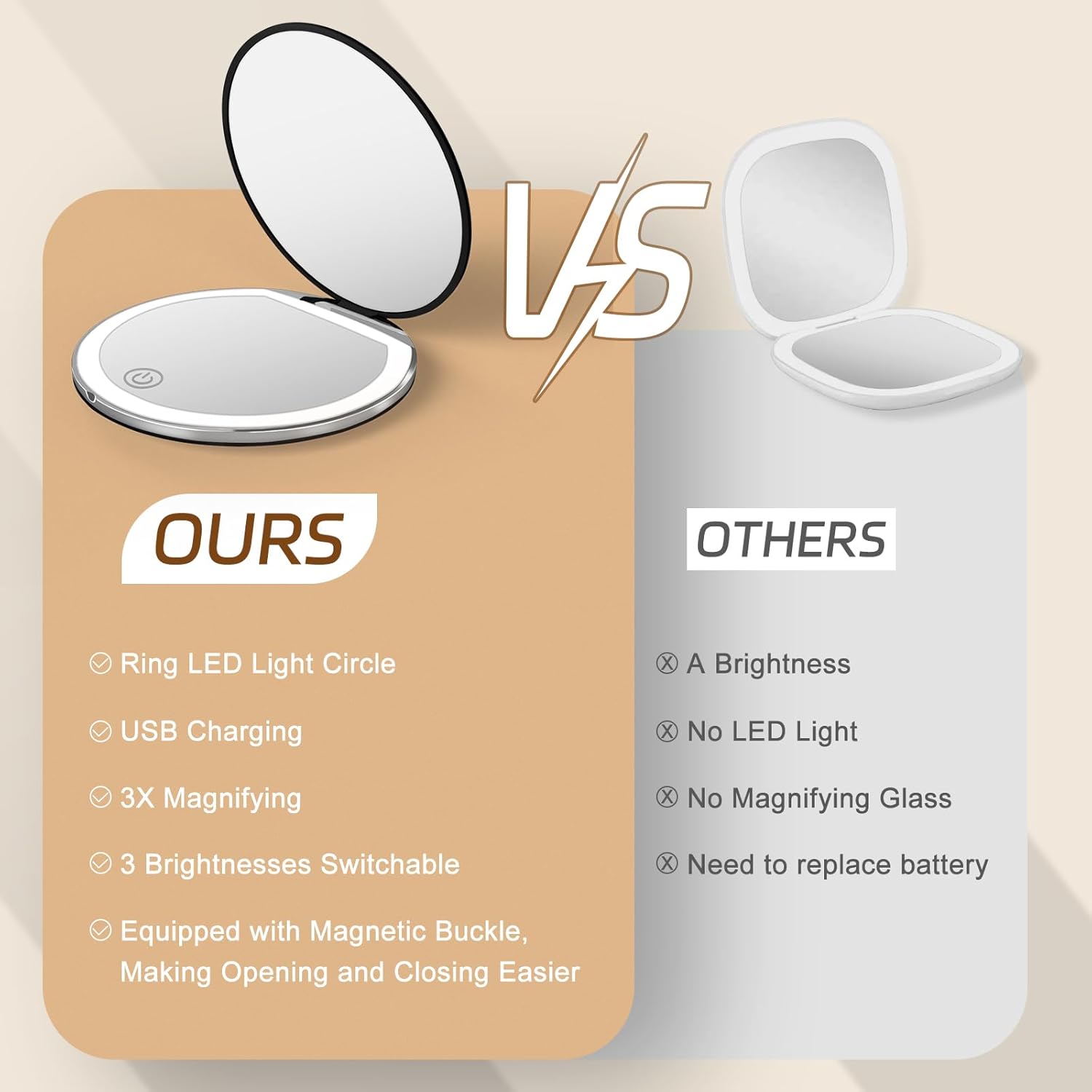 • [Stay Beautiful All The Time]--Our pocket mirror is lightweight, compact, easy to carry, and equipped with a USB cable, so you don't have to worry about changing batteries at any time. It is the perfect companion for you on the road. Whether in between makeup sessions or on the go, it can create a sophisticated and flawless look, allowing you to look confident and beautiful in any occasion.