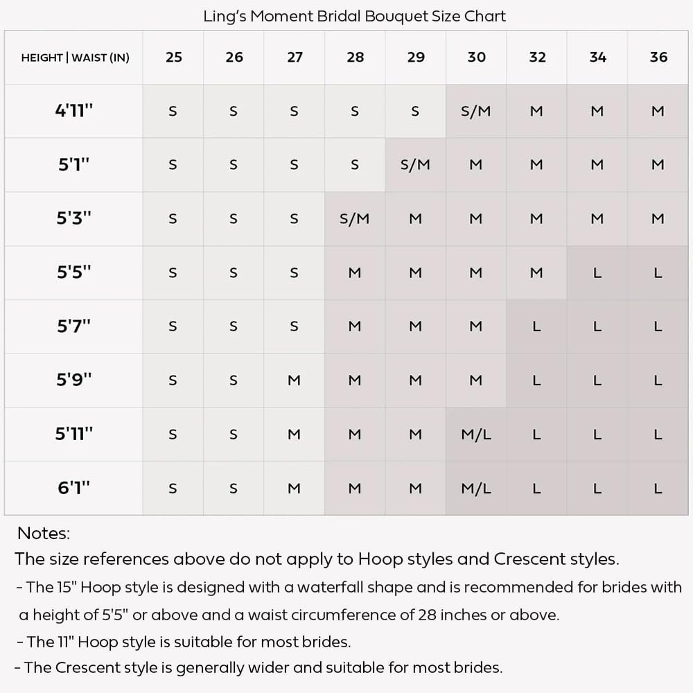 • Size: This Wedding Bouquets for Bride is approx. [13 inches W x 20 inches H]. Handle length 4.3inch. With ribbons card. This size is typically suitable for most brides to carry, this one is recommend for 4'11"-6'1"height and 25" waist, 4'11"-6'1"height and 26" waist, 4'11"-5'7"height and 27" waist, 4'11"-5'3"height and 28" waist, 4'11"-5'1"height and 29" waist, 4'11"height and 30" waist.