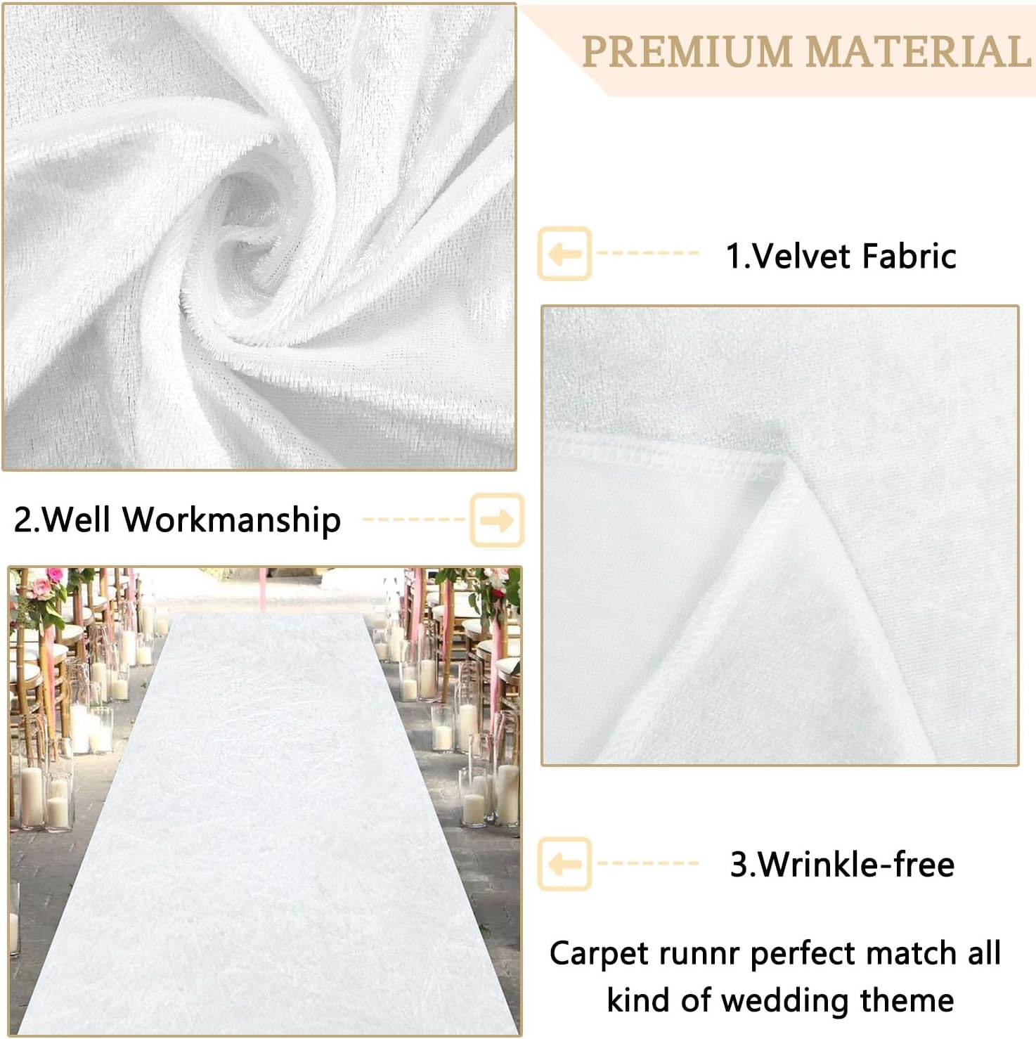 • ❀Size Guide - White Aisle Runner: You will receive 4ft wide by 30ft long white velvet aisle runner rug and 1 pack carpet tapes. Wedding aisle runway for ceremony add a perfect finishing touch to your ceremony venue, becoming a memorable keepsake to be cherish.