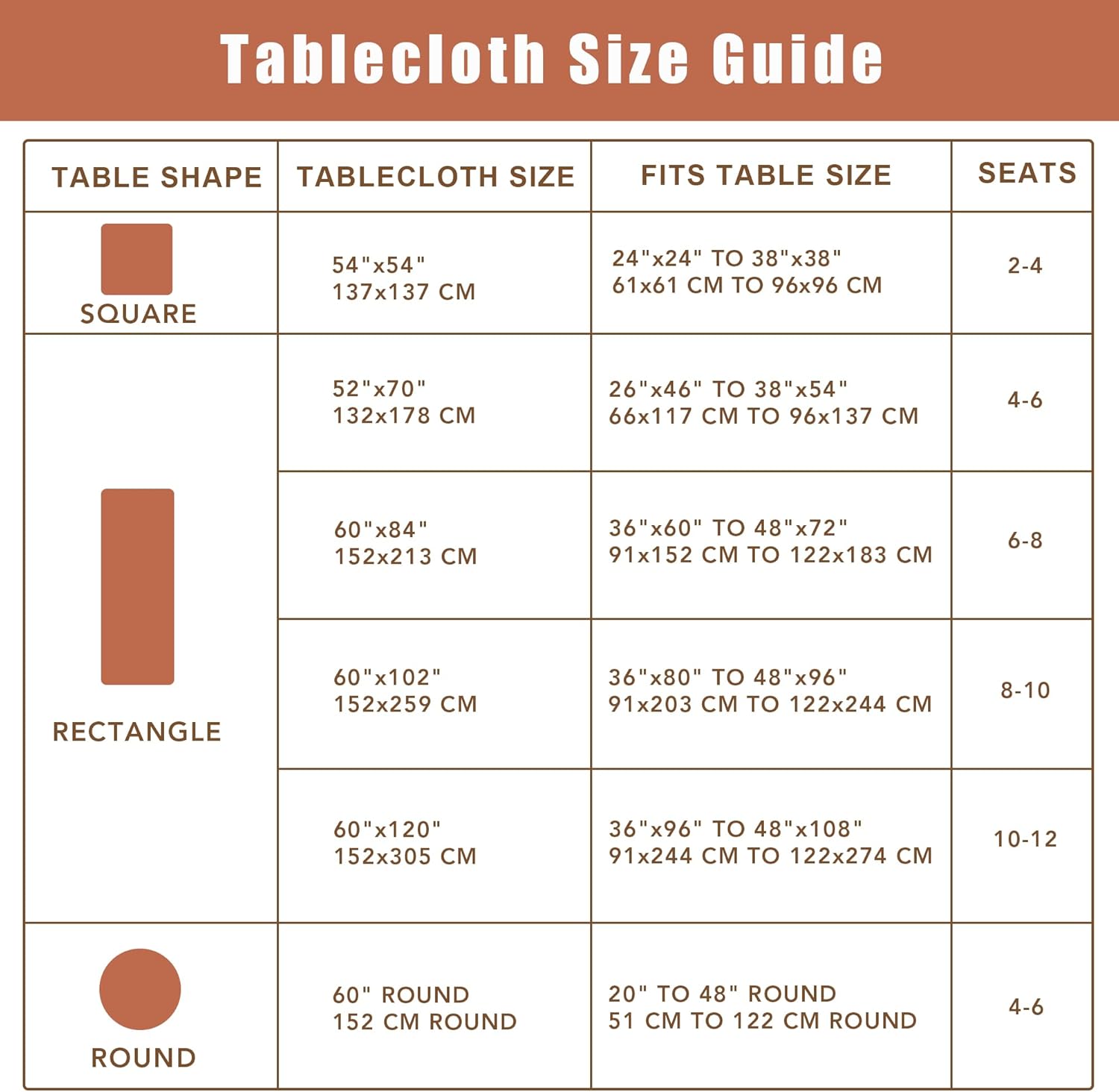 • Size Options: Available in 6 sizes: 54 x 54 inch, 52 x 70 inch, 60 x 84 inch, 60 x 102 inch, 60 x 120 inch, 60 inch Round, please measure your table size before buying.