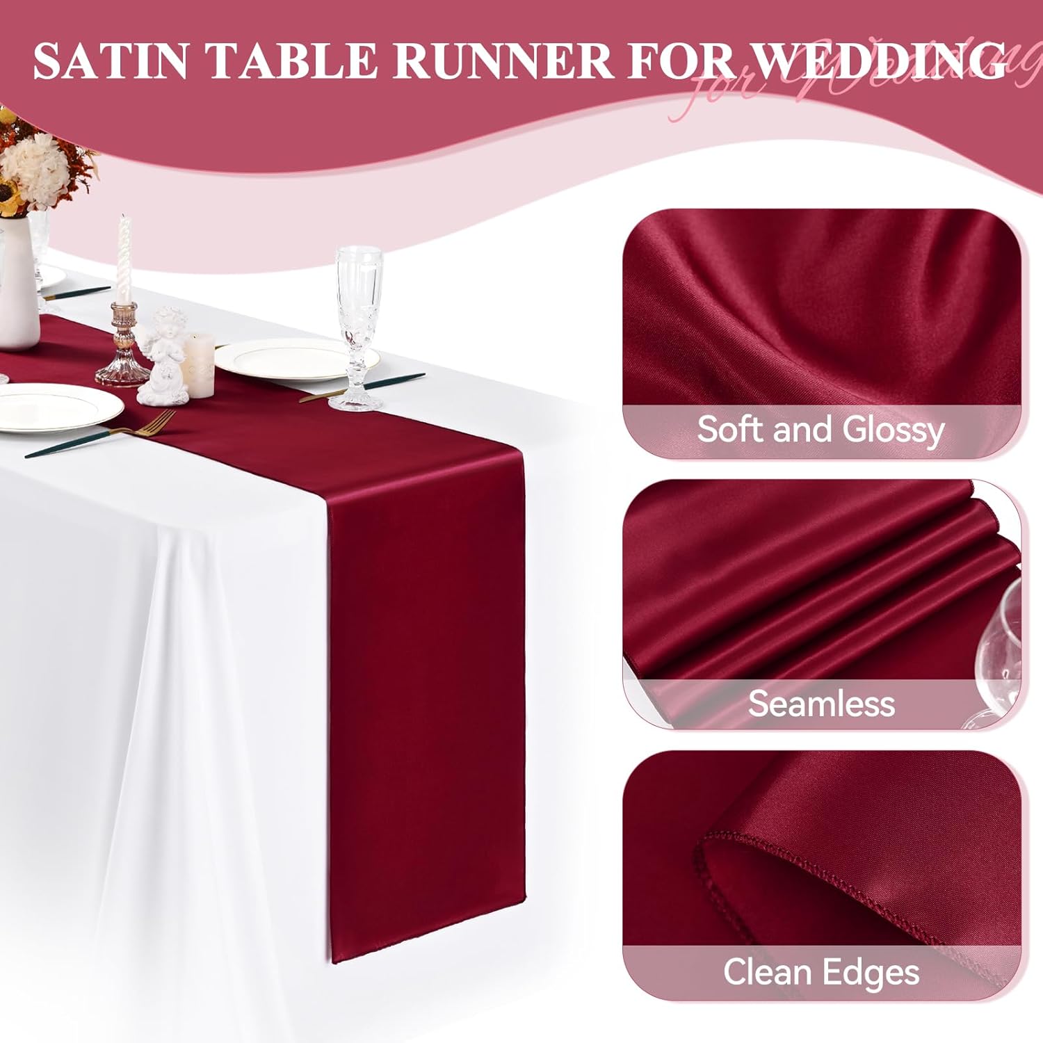 • 🍷【Set includes】20 Pack burgundy satin table runner measures 12" x 108" in size, appropriate for a table that can seat 8-10 people. This satin table runner can fit a 6ft/8ft rectangular table or round table well.This satin table runner is great for event table decorations.Our satin table runner make your dining table more dazzling and outstanding.Purchase our 20 piece satin table runner and save even more.