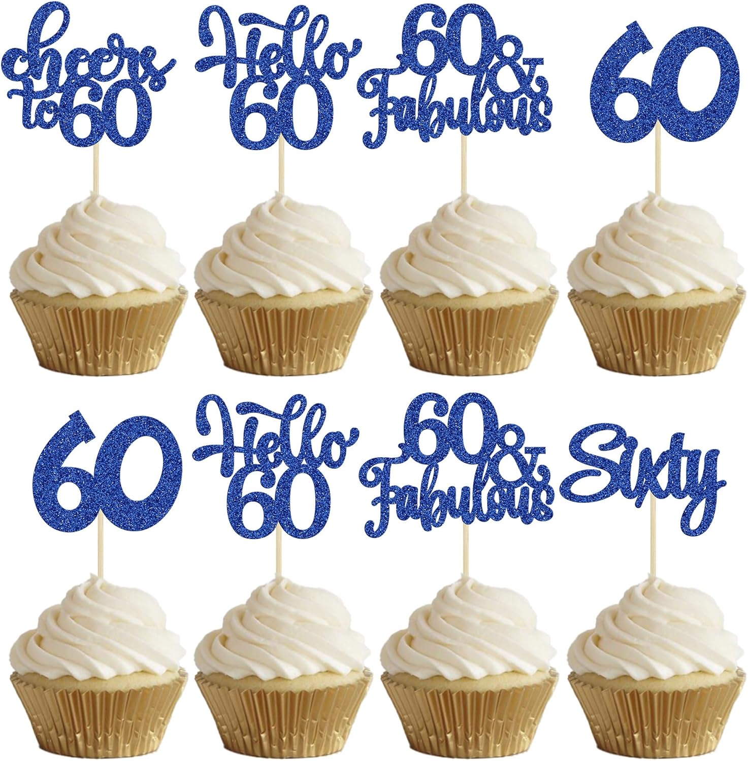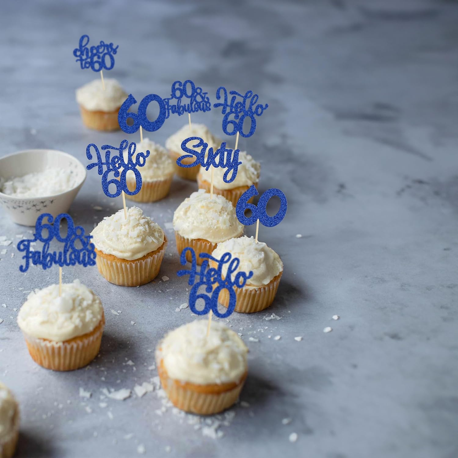 30Pcs Happy 60th Birthday Cupcake Toppers Deep Blue Glitter Sixty Cake Toppers Cheers to 60 Years Old Birthday Cupcake Picks for 60th Birthday Anniversary Party Cake Decorations Supplies