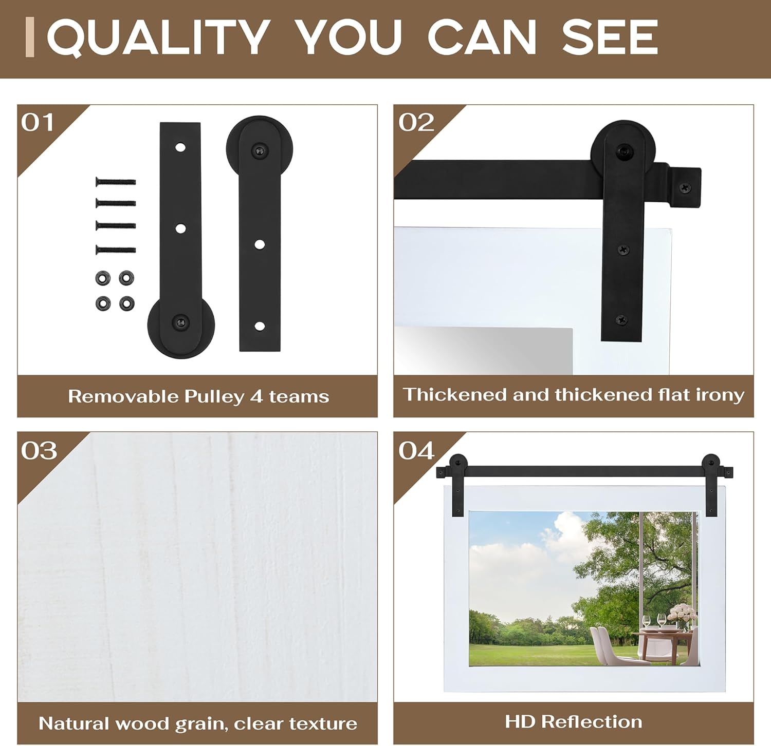 • QUALITY MATERIALS: The frame of the barn door mirror consists of an antique solid wood frame and a sturdy metal bracket. The interior features a 4mm HD silver mirror with clear and distortion-free reflections, providing a better sense of light and projection in your space