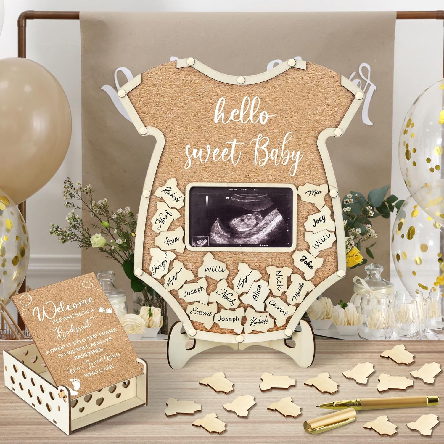 Wenqik 63 Pcs Bodysuit Baby Shower Guest Book Alternatives Set Baby Shower Decorations with Photo Frame Sonogram Frame Keepsake 60 Wood Slices Guest Book for Birthday