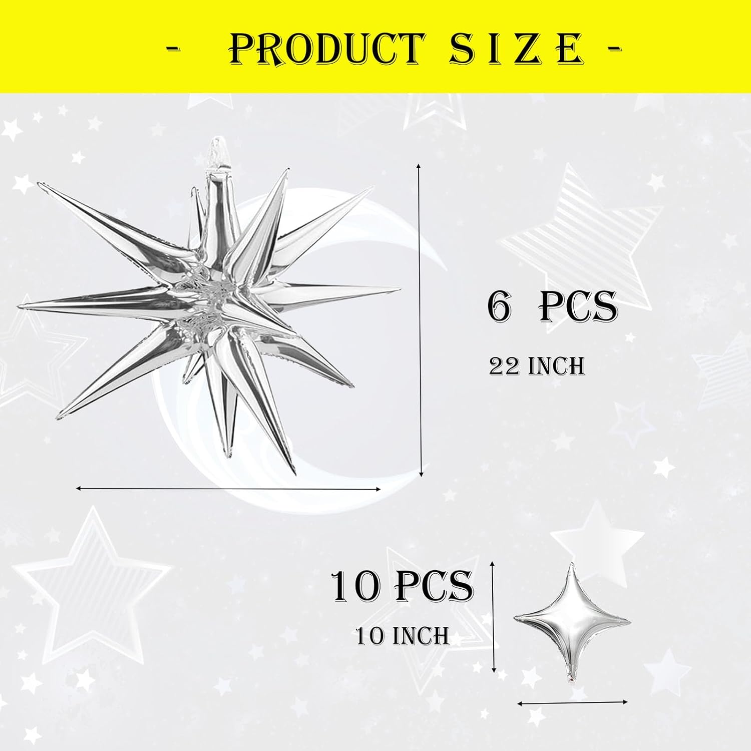 • 【Package】You will get 6 pack 22 inch silver explosion star balloons, 10pcs 10 inch four pointed star balloons, very elegant and super valuable.