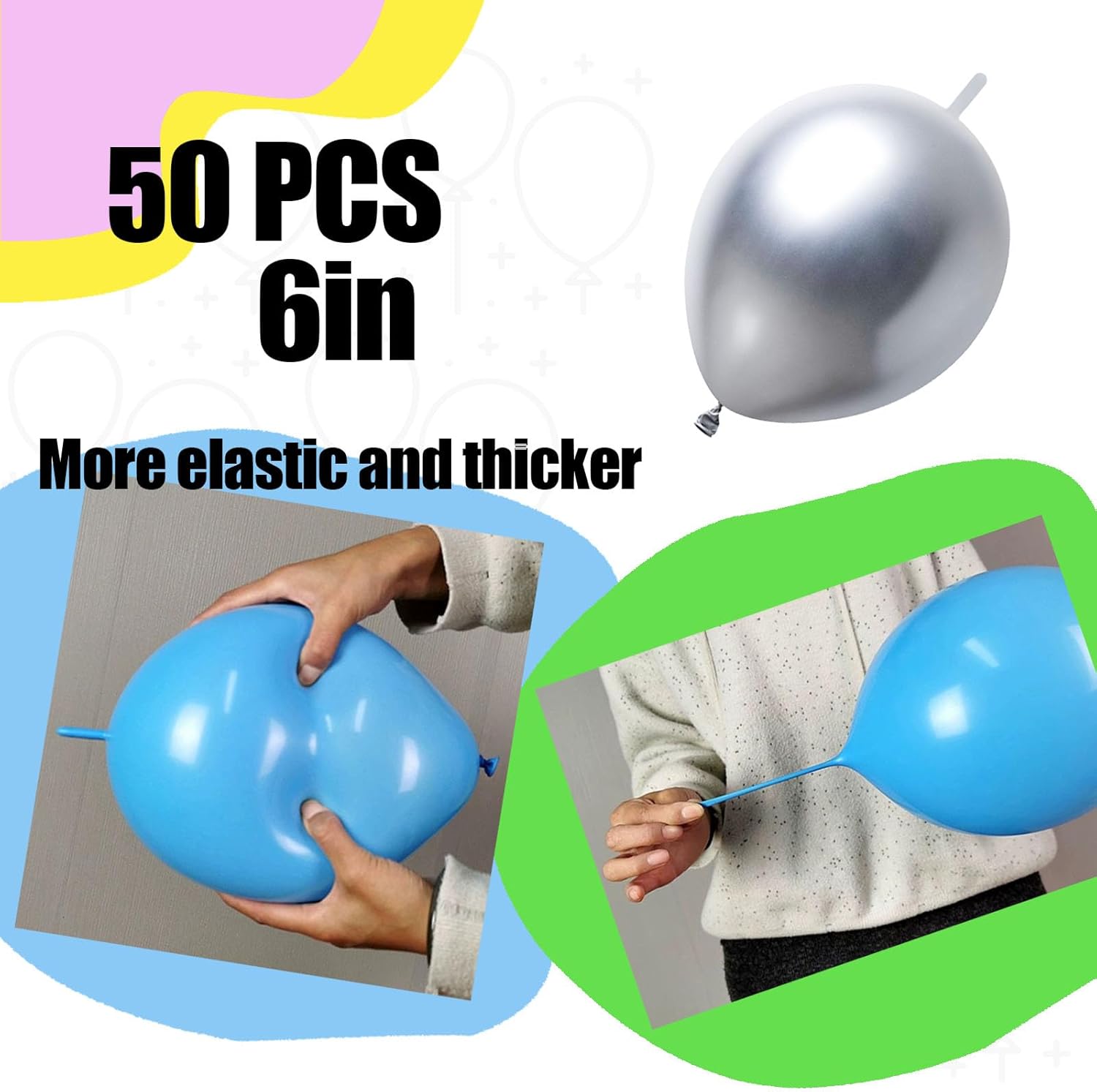 • 【HIGH QUALITY MATERIALS】These silver link balloons are made of high-quality latex and have good elasticity. The smooth and thickened surface makes the balloon more durable and no popping.