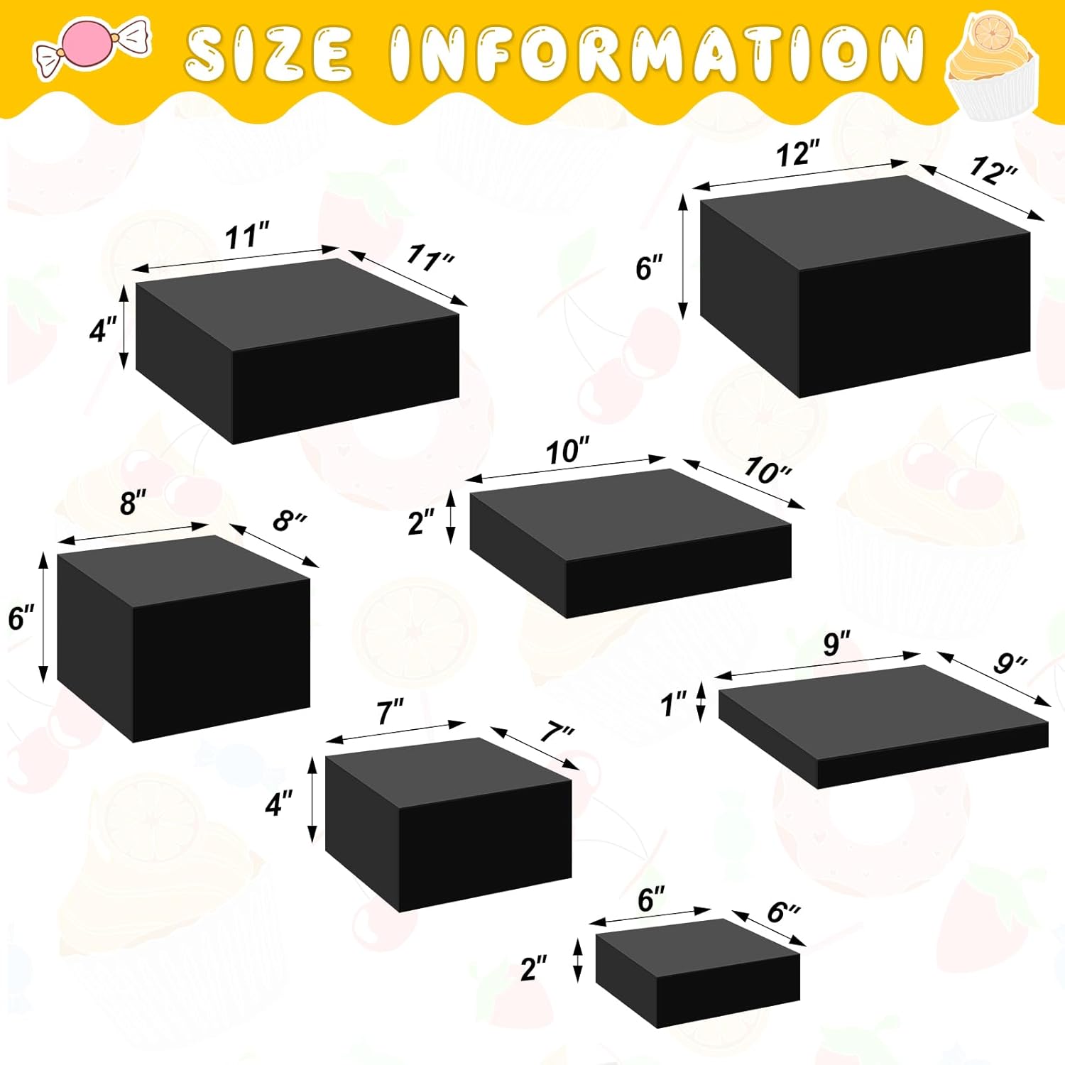 • Comprehensive Size Variety: presenting an impressive variety of acrylic risers for dessert table in a package of 7; These cubes come in dimensions of 6 x 6 x 2 inches, 7 x 7 x 4 inches, 8 x 8 x 6 inches, 9 x 9 x 1 inches, 10 x 10 x 2 inches, 11 x 11 x 4 inches, and 12 x 12 x 6 inches, ensuring to meet your display needs; Please note that the covering film needs to be torn off before use