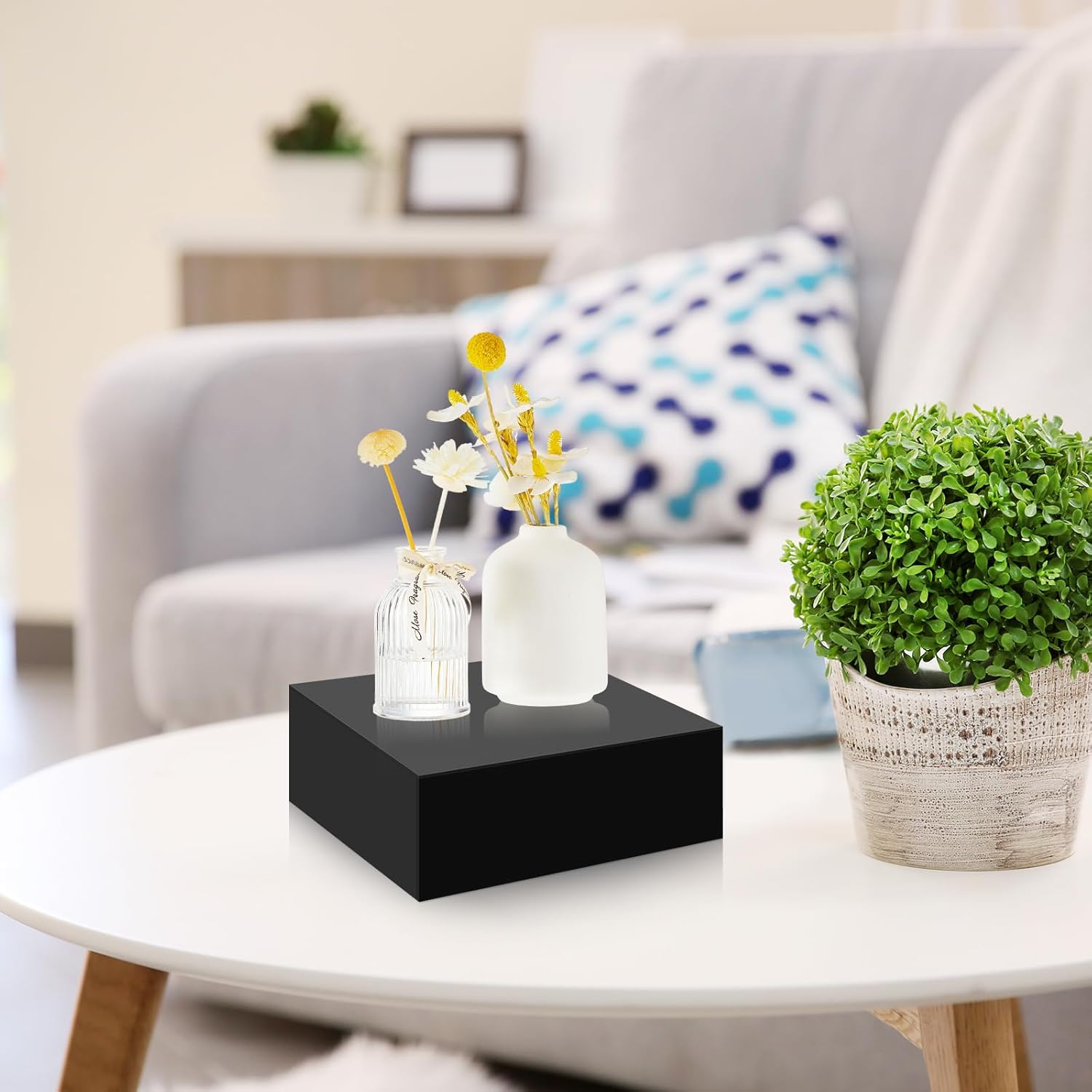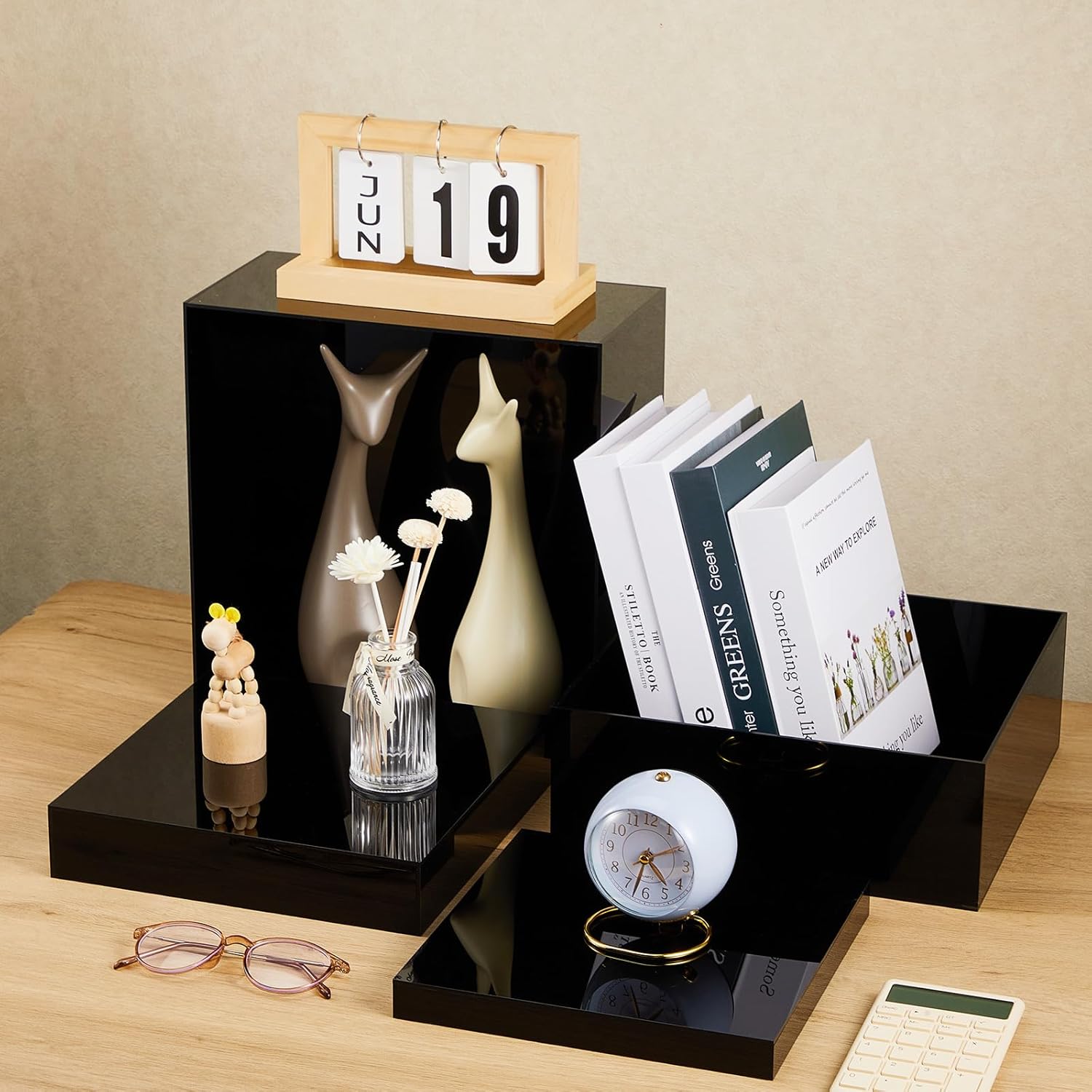 • Black Aesthetics: our acrylic display stands showcase a simple yet elegant design; The black color offers an unobstructed view of your displayed items, enhancing their beauty and visibility; Whether it's jewelry, cakes or other products, these cubes ensure they are the center of attention