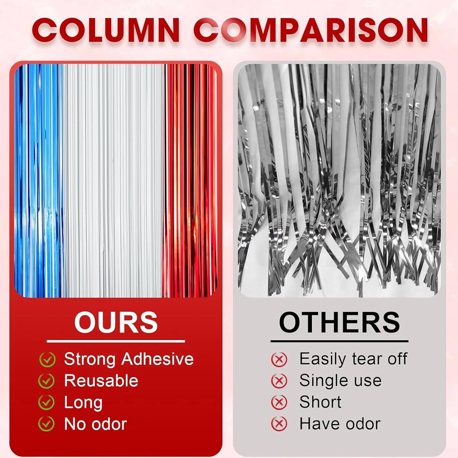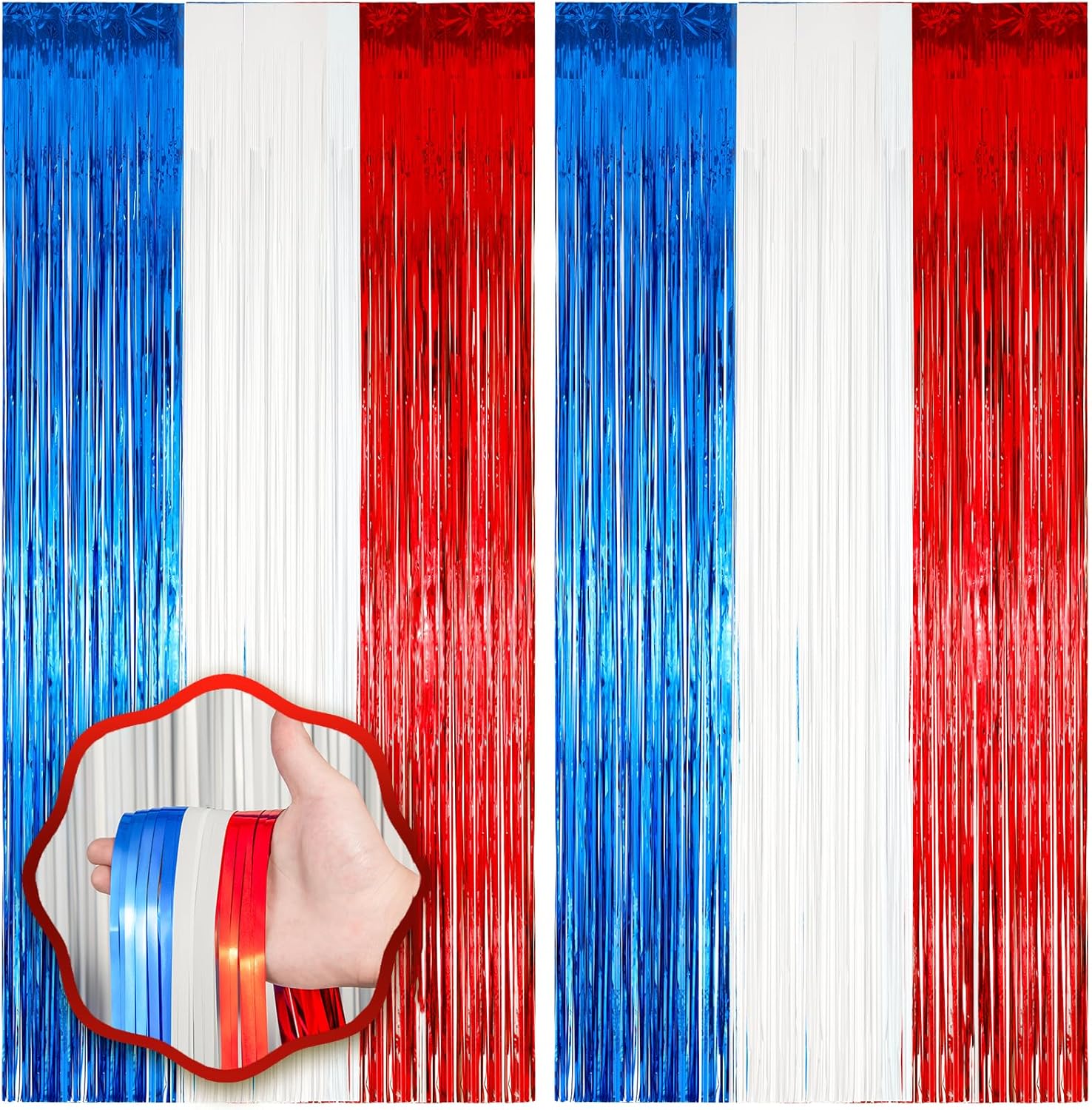 2 Pack Red White and Blue Foil Fringe Backdrop Curtains, Tinsel Streamers Party Decorations, Fringe Backdrop for Patriotic, Memorial Day, 4th of July, Independence Day