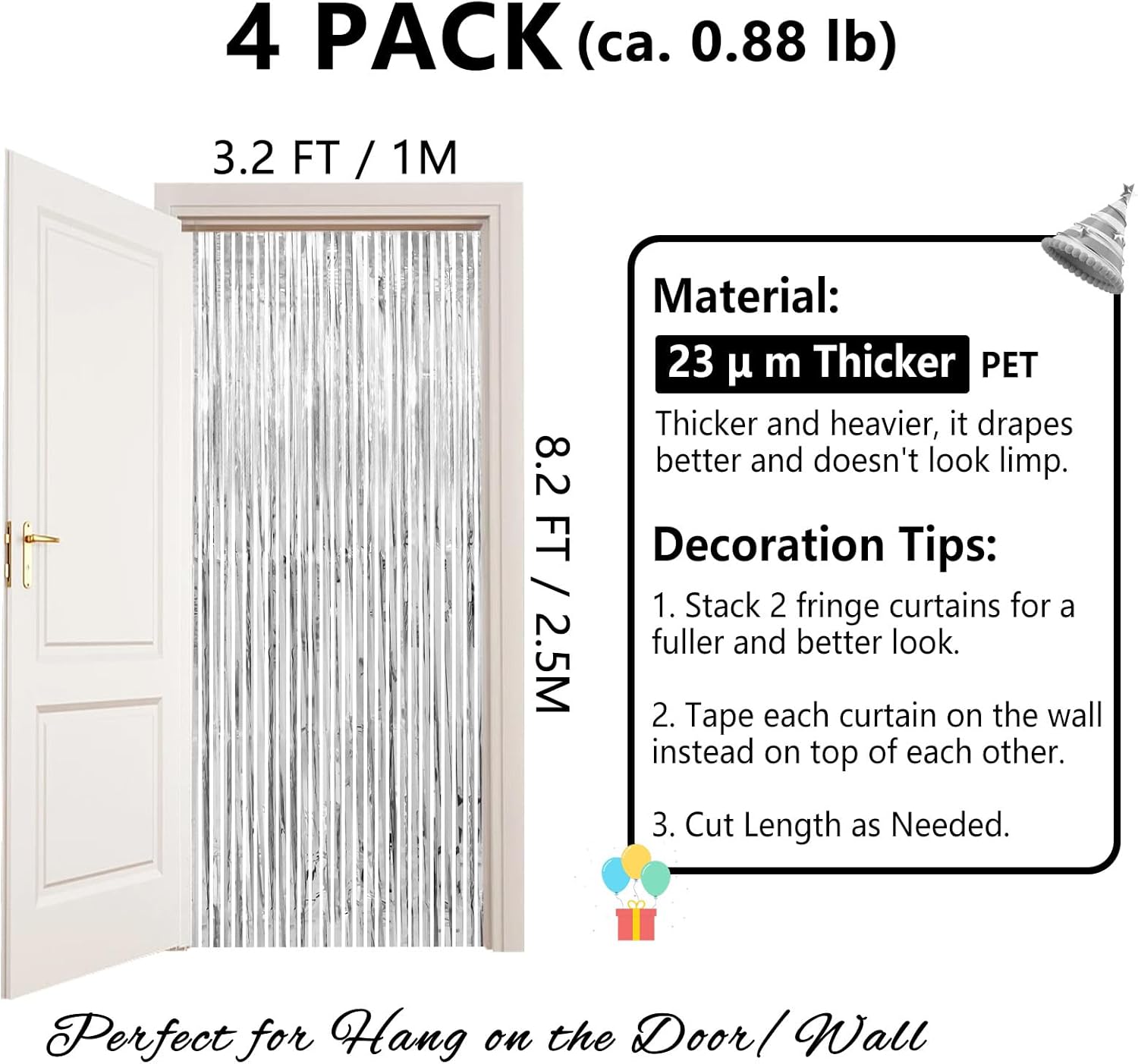 Silver Streamers Party Decorations - Thicken 4 Pack 3.2 x 8.2 FT - Black Tinsel Foil Fringe Backdrop Curtains, Photo Booth Props for Birthday, Graduation, Bachelorette, Prom, Engagement, Disco Party