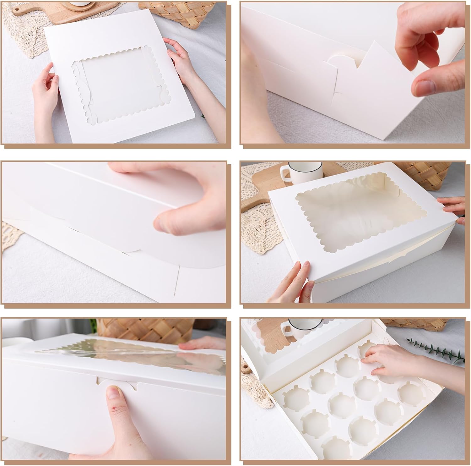 • EASY TO ASSEMBLE - Our cupcake box comes flat and pre-folded, which is easy and quick to fold and assemble box without glue or other tools. In order to achieve the perfect effect, please assemble the box according to the indentation of the bakery box.
