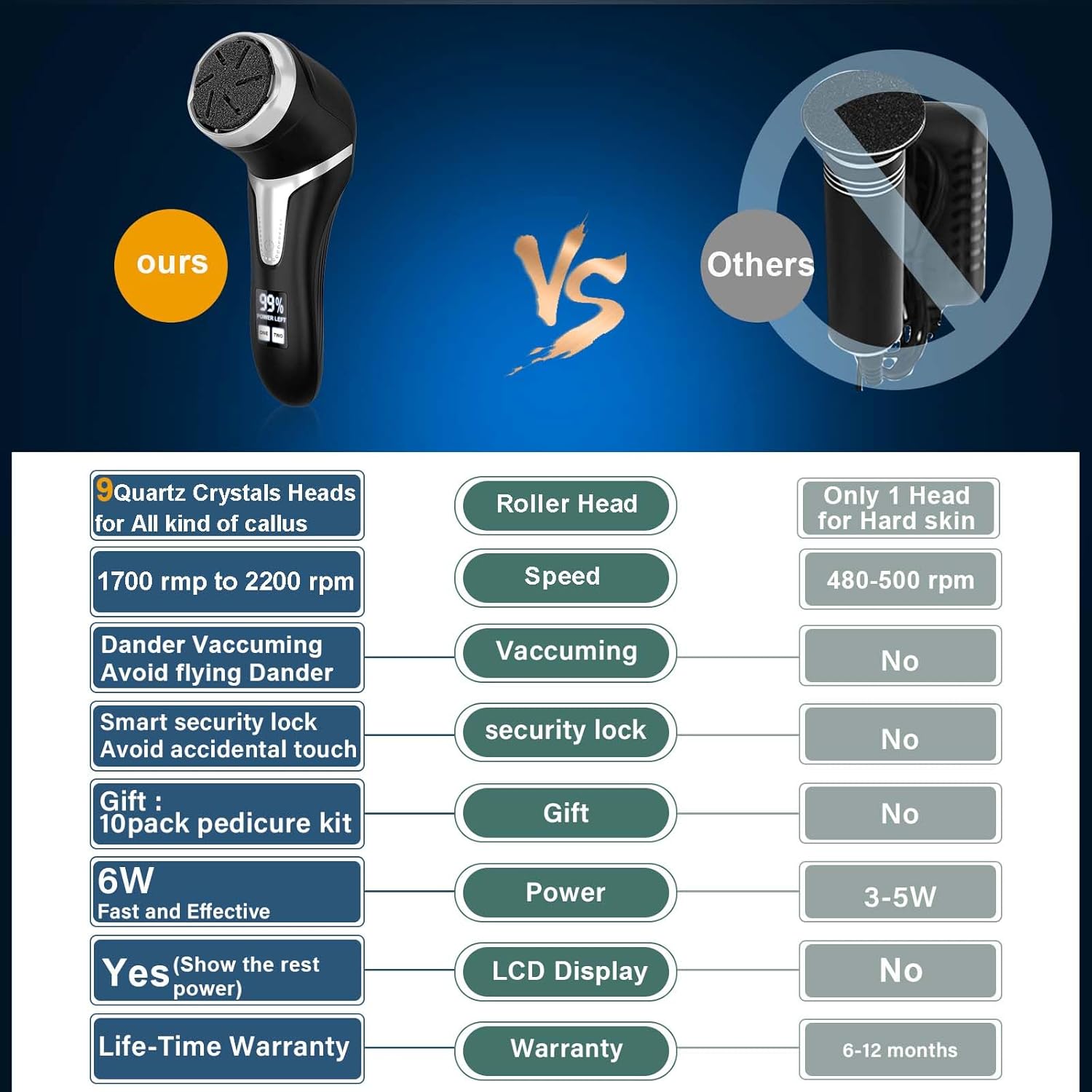 • Pedicure kit with 9 Grinding Head, 2 Speed, with VACUUM ABSORPTION----- 9 Quartz Crystals Removable Roller Heads and 2 Speed Correspond to the roughness required to remove the calluses on the feet. UPGRADE powerful callus remover with dander vacuum cleaner quickly sucks away foot scraps, cle.an and hygienic, and sucks while grinding. dust-free, and foot scraps will not be scattered in air or floor, an essential home pedicure kit for people who has cleanliness.