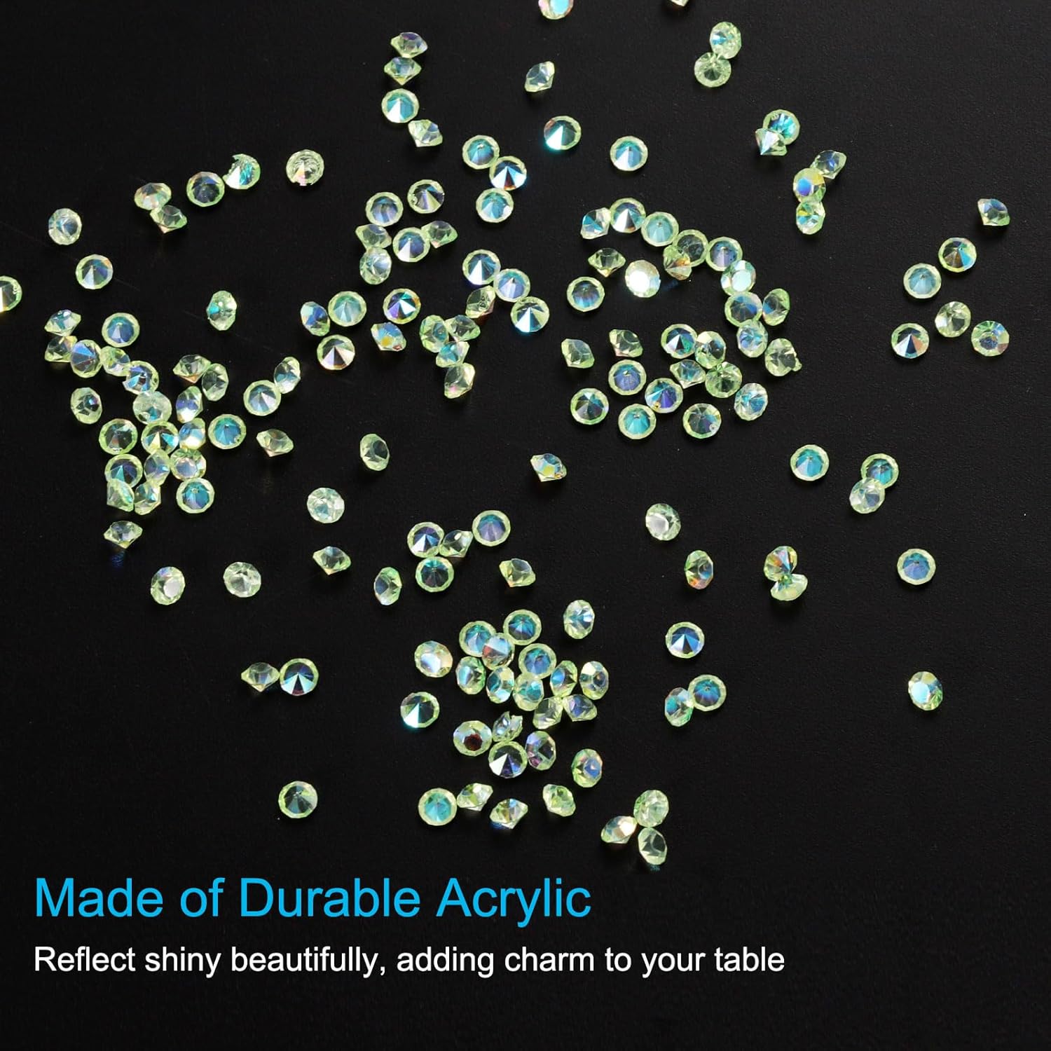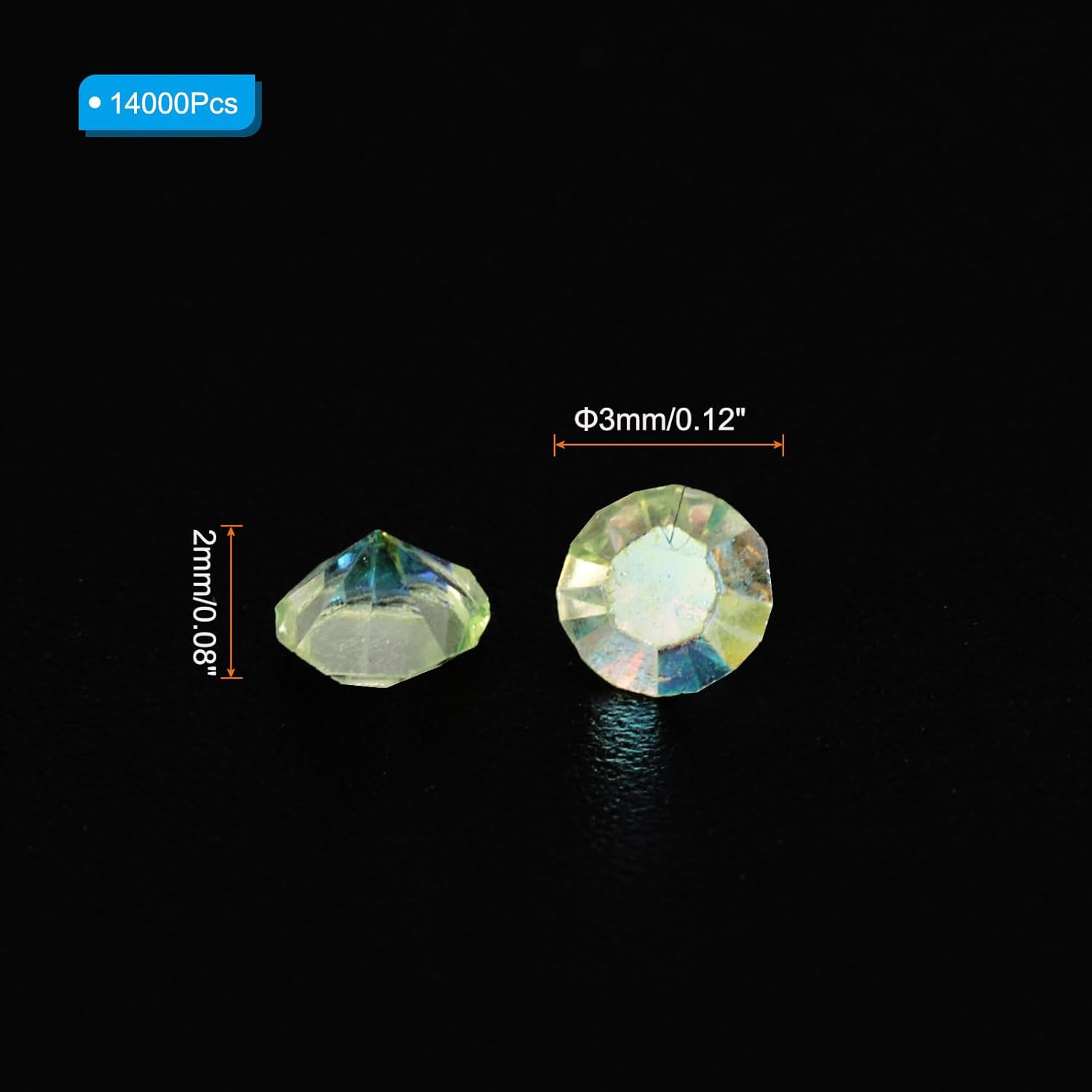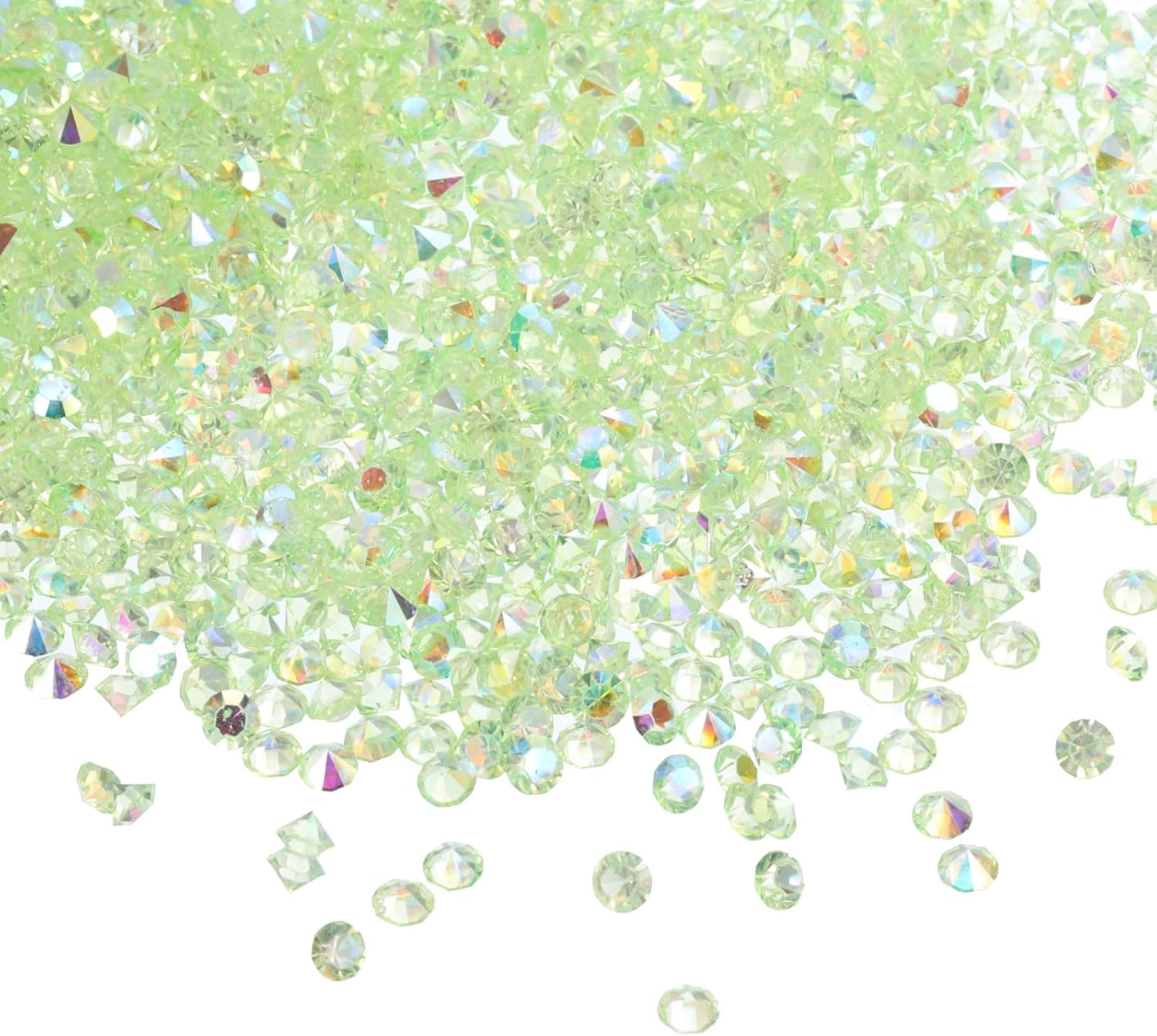 • Color: Light Green AB; Material: Acrylic; Size: 3mm x 2mm/ 0.12 x 0.08 inch (Dia.x H); Packing List: 14000Pcs x Acrylic crystal diamonds