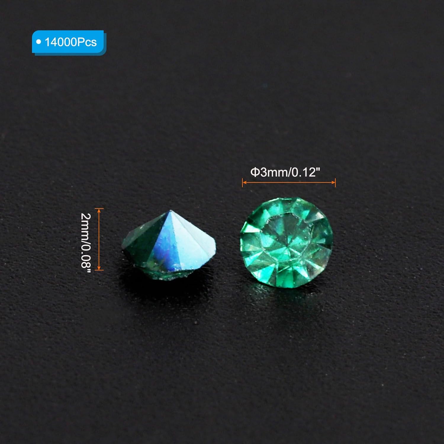 • Color: Dark Green AB; Material: Acrylic; Size: 3mm x 2mm/ 0.12 x 0.08 inch (Dia.x H); Packing List: 14000Pcs x Acrylic crystal diamonds
