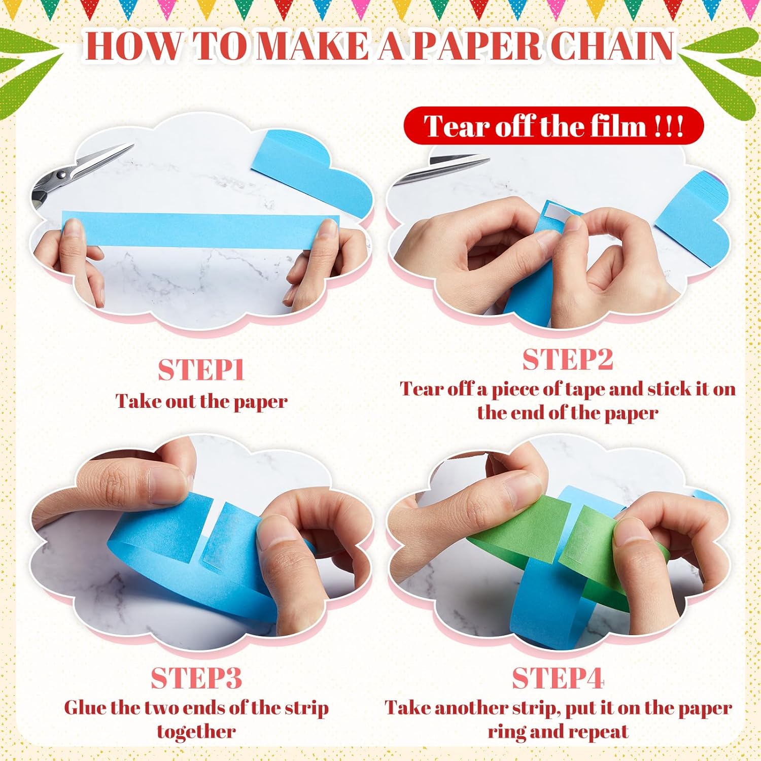 • Worry Less Crafting Experience: crafting has never been easier with our DIY paper chain strips that equipped with sticky tape; You just need to stick the 2 ends of the paper together with the tape, match the color as you like, ring by ring, and you will get an exquisite handicraft, without complex or dangerous procedures; You can quickly turn your ideas into reality without the stress of sourcing for additional crafting materials