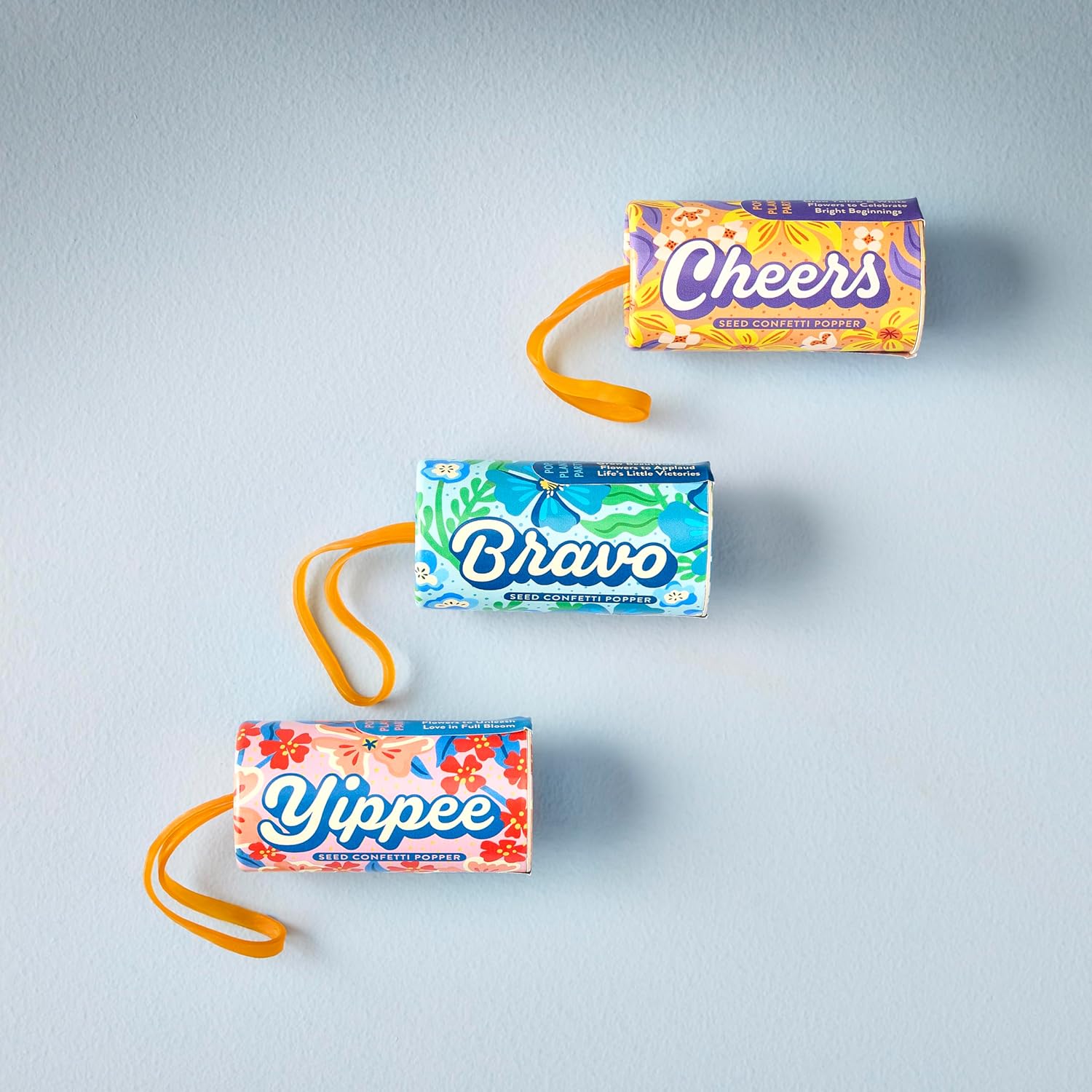 • Package Contents: Modern Sprout Seed Confetti Poppers - Bravo – Blue Flower Seed Blend: Baby Blue Eyes, Blue Flax, Cheers – Yellow Flower Seed Blend: Alyssum, Black-Eyed Susan, Yippee – Red & Pink Flower Seed Blend: Catchfly, Clarkia (Pack of 12)