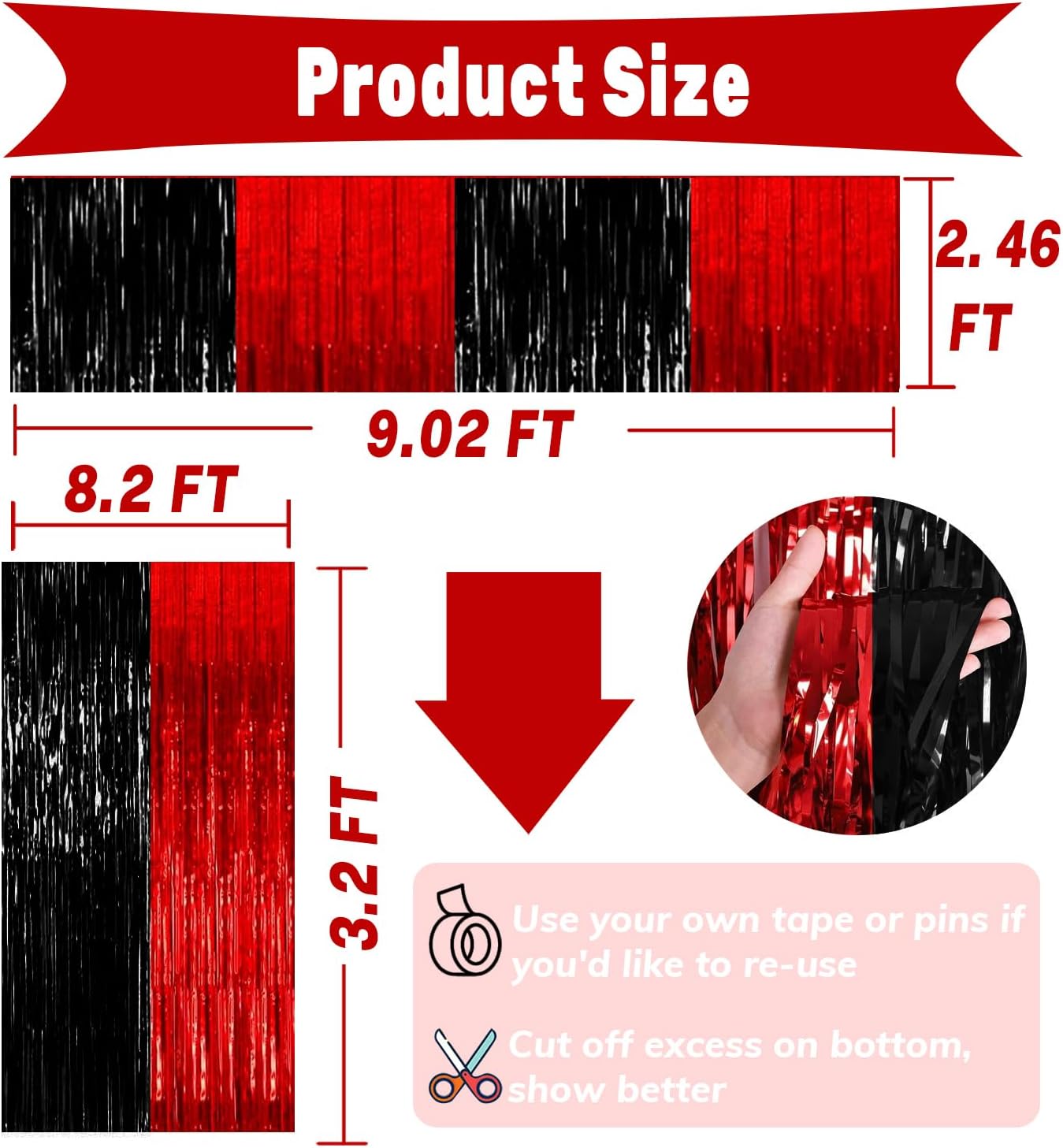 • Material: Plastic 2 Pack Party Streamers: 3.2ft x 8.2ft(W*L) 2 Pack Foil Fringe Tinsel Table Skirt: 30inx 108in(W*L) Please confirm the size you need before buying. Peel off the sticker on the back and stick it on the door you want to decorate, the size fit for any party backdrop, which can create an impressive decorative effect.