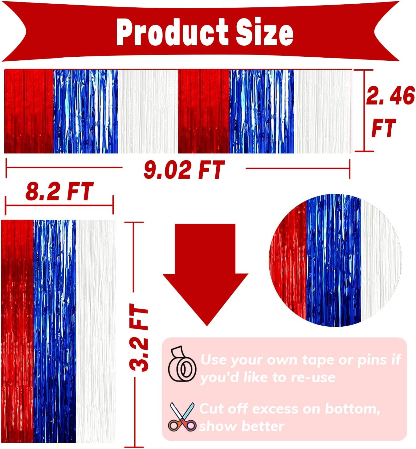 • Material: Plastic 2 Pack Party Streamers: 3.2ft x 8.2ft(W*L) 2 Pack Foil Fringe Tinsel Table Skirt: 30inx 108in(W*L) Please confirm the size you need before buying. Peel off the sticker on the back and stick it on the door you want to decorate, the size fit for any party backdrop, which can create an impressive decorative effect.