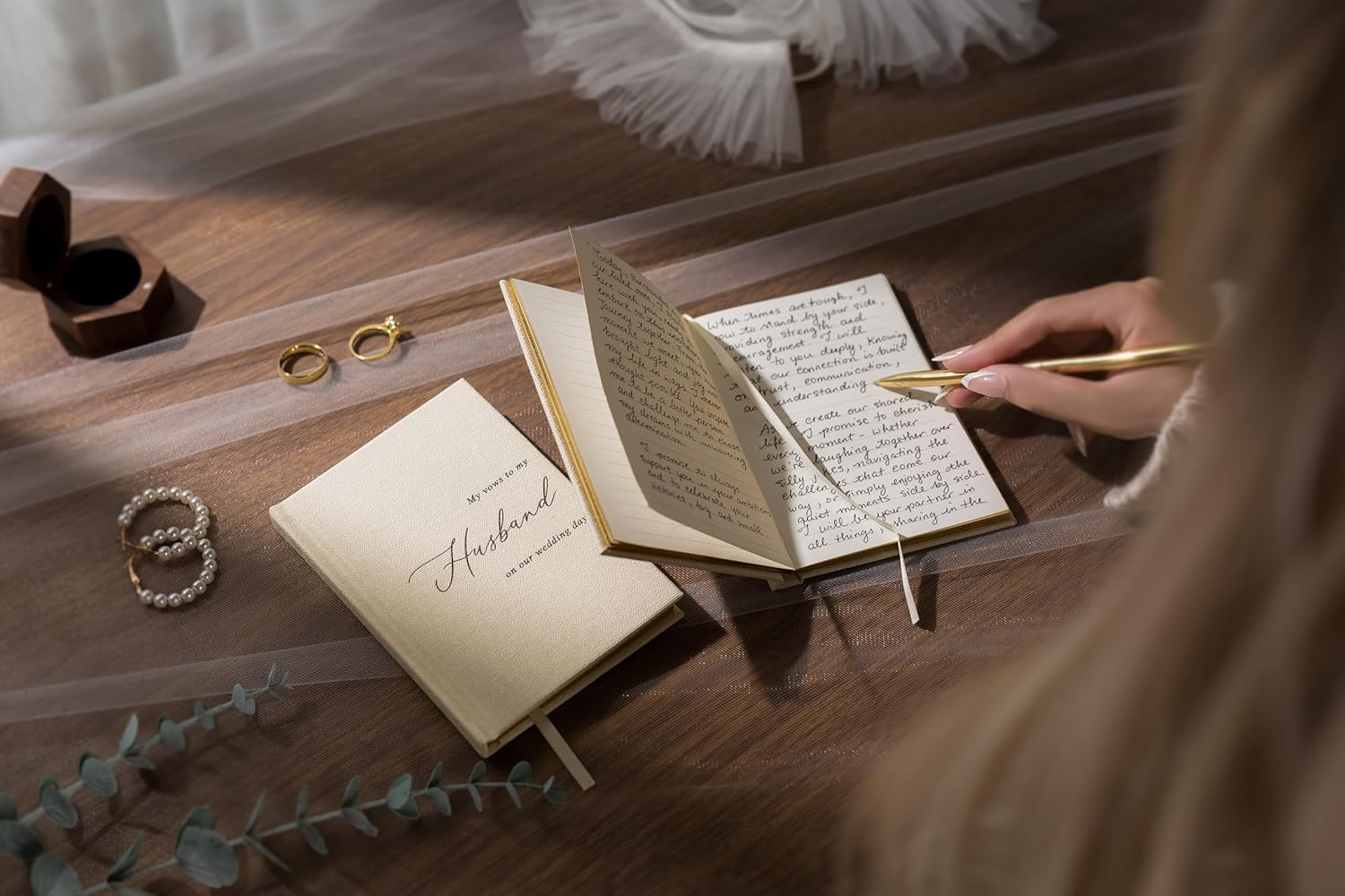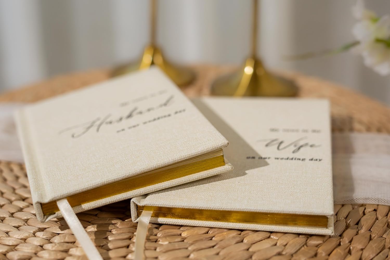 • Each vow book is meticulously crafted with 140 gsm paper, ensuring durability and a luxurious feel. Each book contains 40 lined pages with gold gilded edges, adding a touch of elegance to your wedding day prop or bridal shower gift.