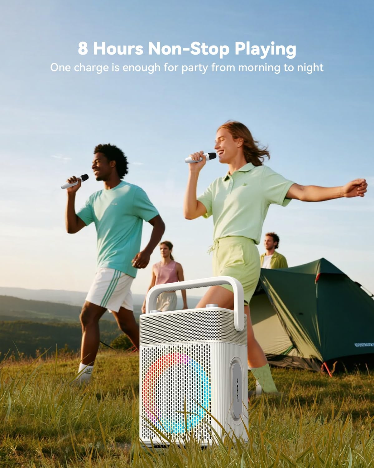 • RECHARGEABLE & LONG-LASTING BATTERY - This portable karaoke system features a built-in 10,000 mAh lithium-ion rechargeable battery that provides up to 8 hours of playtime. In the absence of audio input, the karaoke device connected to the TV will switch to energy-saving mode, and it will resume play mode when audio is detected. Additionally, if the handheld microphone speaker remains inactive for over 15 minutes, it will automatically power down, intelligently conserving energy and enhancing convenience for car karaoke use. You'll appreciate the extended battery life of this waterproof karaoke machine!