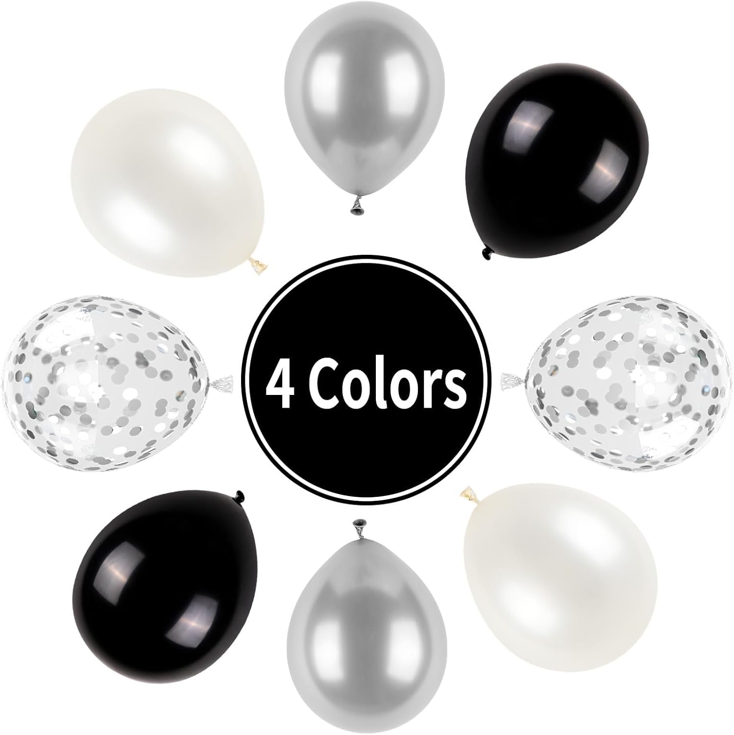 • ใ€12Inch Party Balloons Setใ€‘: The black and silver balloons set includes 20pcs matte black balloons, 10pcs metallic silver balloons, 15pcs silver confetti balloons, 15pcs pearl silver balloons, 1pc silver ribbon. 61pcs in total. Elevate your celebrations with our birthday party balloons!