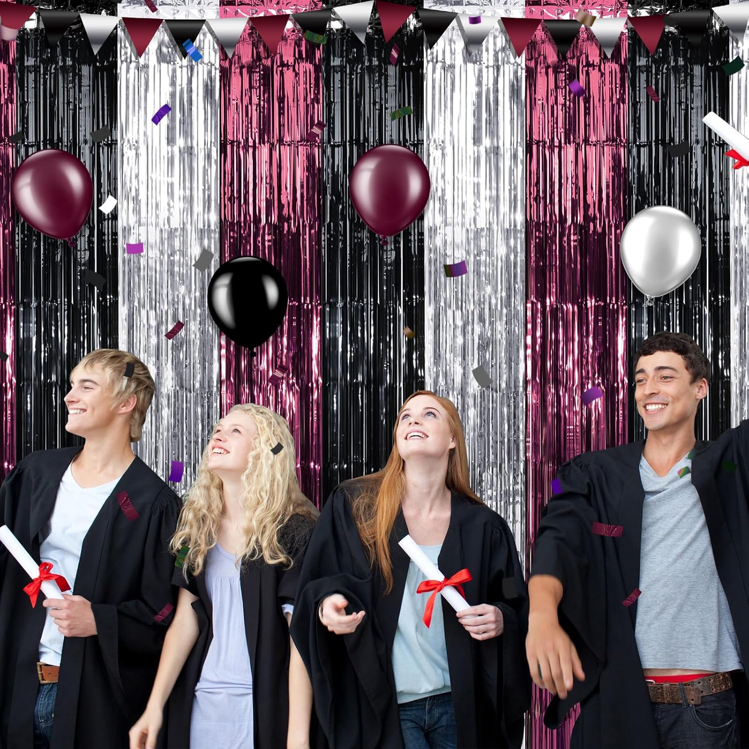 3 Pack 3.3Ft x 6.6Ft Graduation Foil Fringe Curtain Backdrop Decorations, Maroon Black Silver Metallic Tinsel Foil Streamers Curtain Photo Booth Background for Graduation Prom Wedding Birthday Party