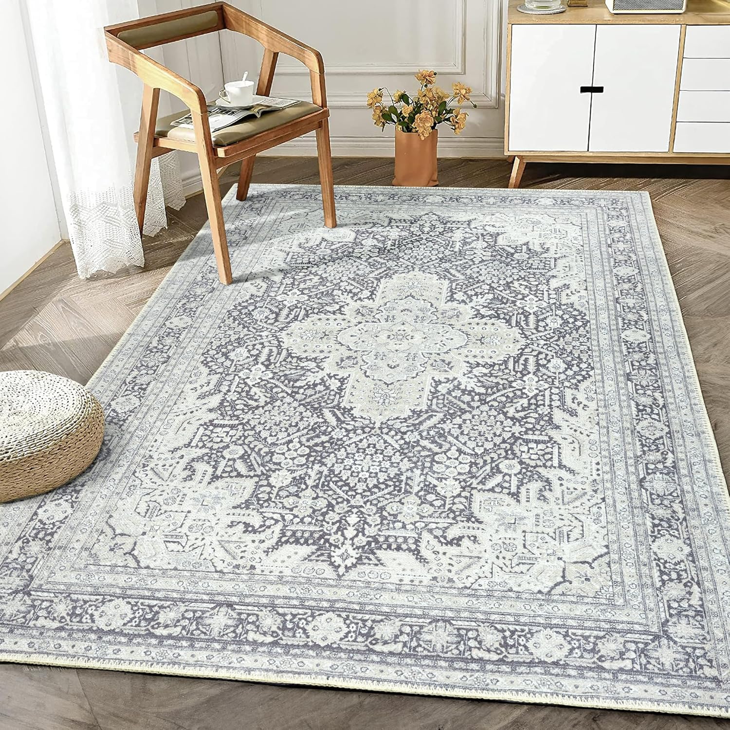 Bloom Rugs Washable Non-Slip 4' x 6' Rug - Charcoal Blue Traditional Medallion Area Rug for Living Room, Bedroom, Dining Room, and Kitchen - Exact Size: 4' x 6'