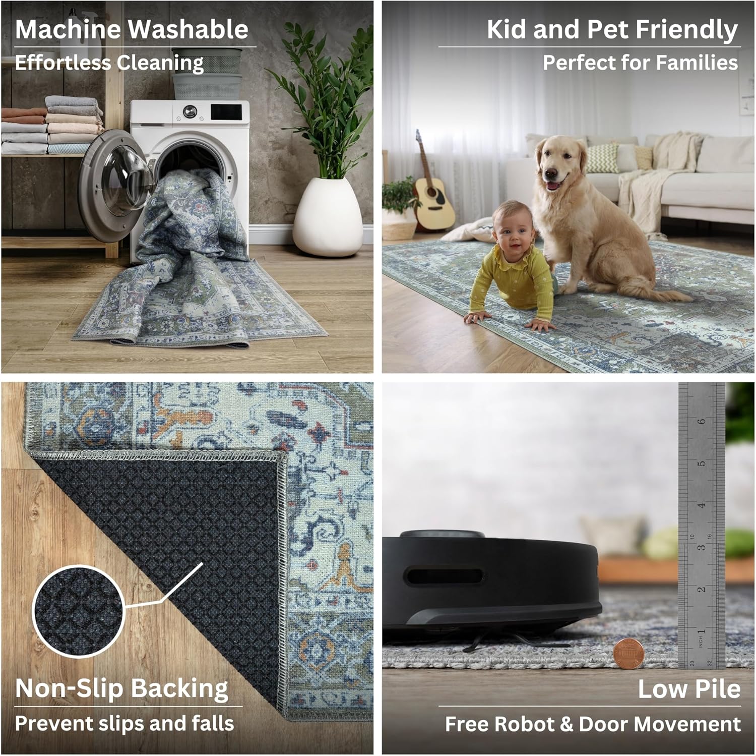 • MACHINE WASHABLE: Machine wash on delicate cycle (do not use bleach) at 85°F (30°C) and line dry or dry on air-only cycle without heat. Vacuum regularly and spot clean small stains. This easy to clean rug is perfect for families with kids and pets, and for high traffic areas.