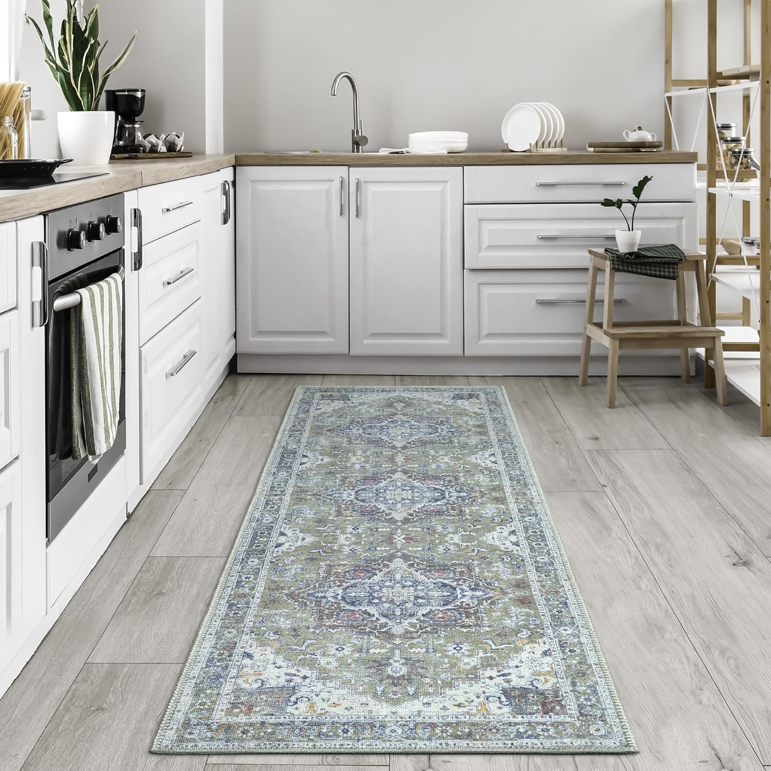 Bloom Rugs Washable Non-Slip 12 ft Runner - Green/Blue Traditional Medallion Runner for Entryway, Hallway, Bathroom, and Kitchen - Exact Size: 2.5' x 12'