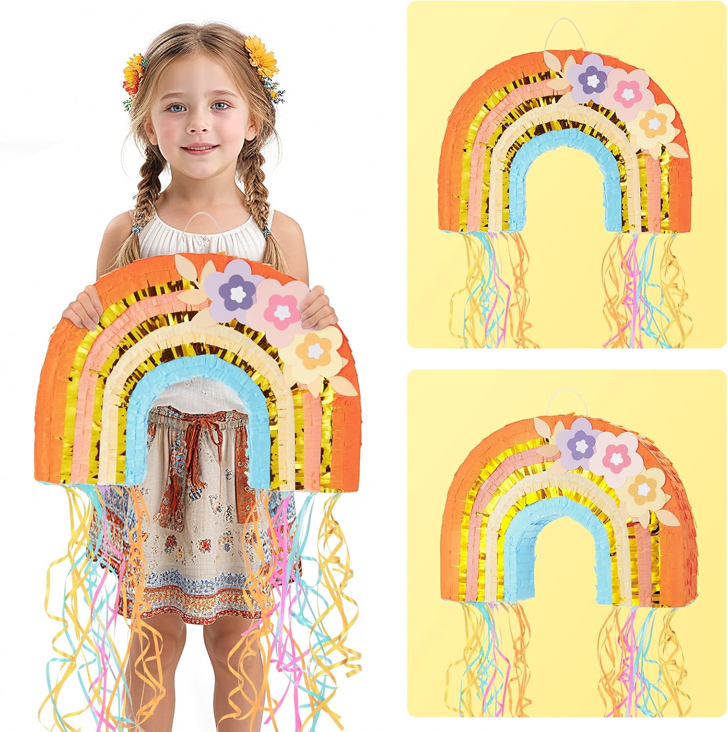 • 【COLORFUL BOHO DECOR】 - This kids piñata is designed with colorful bohemian rainbow, embodying the essence of charming summer vibes. The fantastic color of the piñata features orange, pink and gold, adding a touch of elegance to any children's party or celebration.